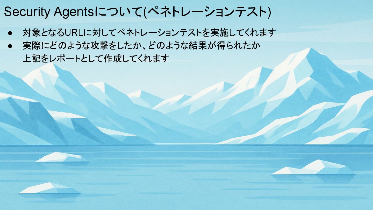 Security Agentsについて(ペネトレーションテスト) • 対象となるURLに対してペネトレーションテストを実施してくれます • 実際にどのような攻撃をしたか、どのような結果が得られたか 上記をレポートとして作成してくれます