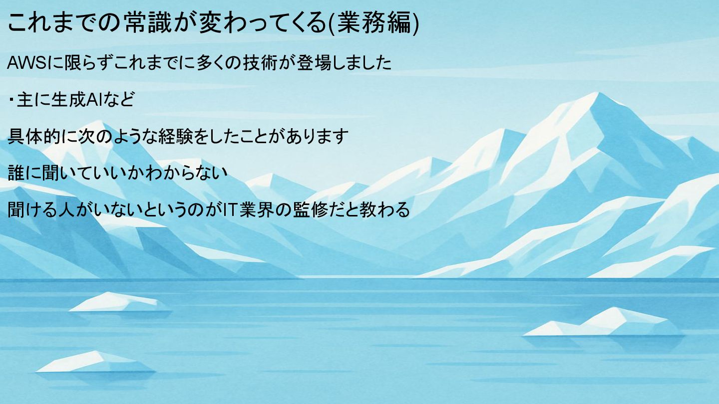 これまでの常識が変わってくる(業務編) AWSに限らずこれまでに多くの技術が登場しました ・主に生成AIなど 具体的に次のような経験をしたことがあります 誰に聞いていいかわからない 聞ける人がいないというのがIT業界の監修だと教わる