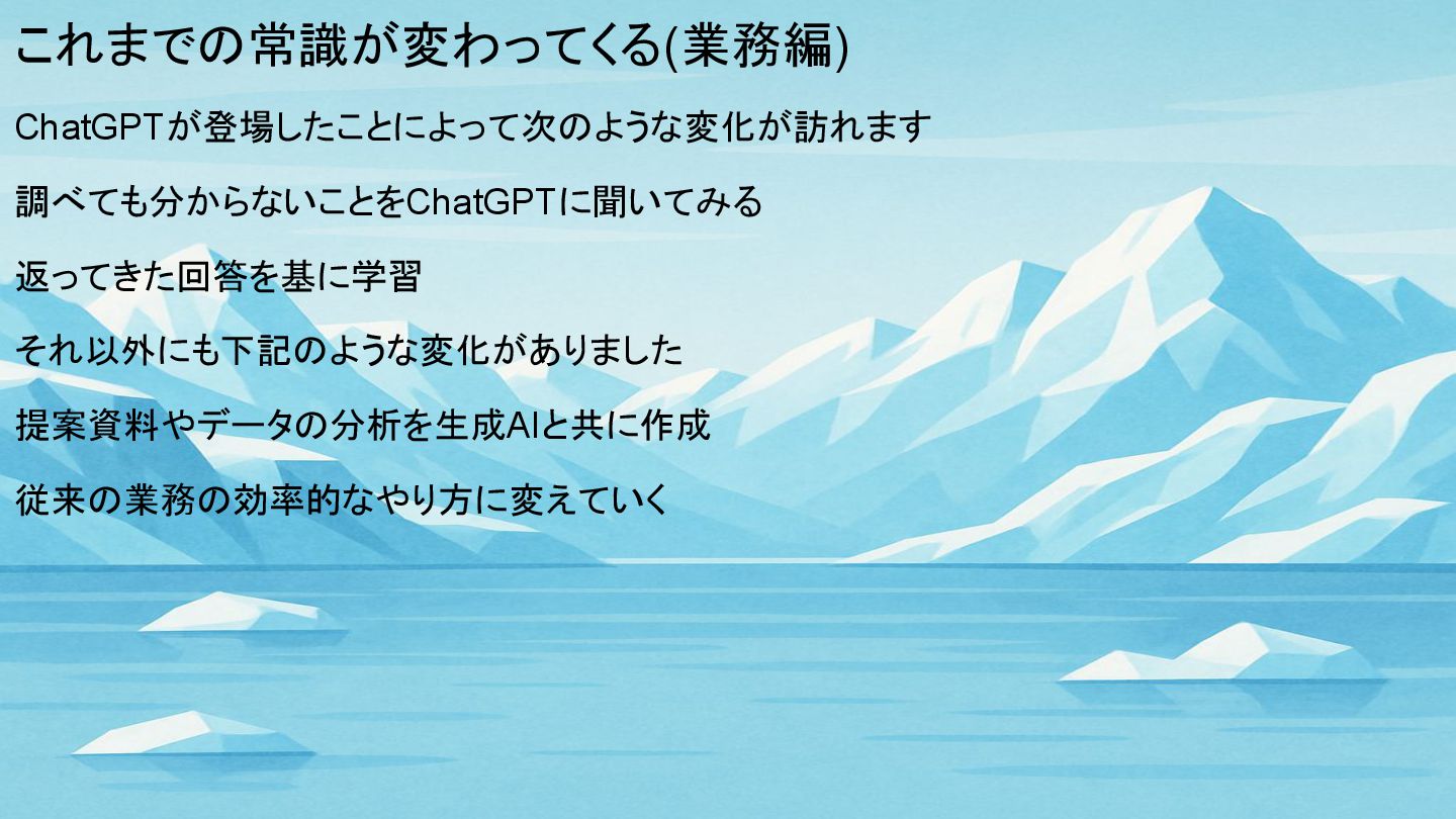 これまでの常識が変わってくる(業務編) ChatGPTが登場したことによって次のような変化が訪れます 調べても分からないことをChatGPTに聞いてみる 返ってきた回答を基に学習 それ以外にも下記のような変化がありました 提案資料やデータの分析を生成AIと共に作成 従来の業務の効率的なやり方に変えていく
