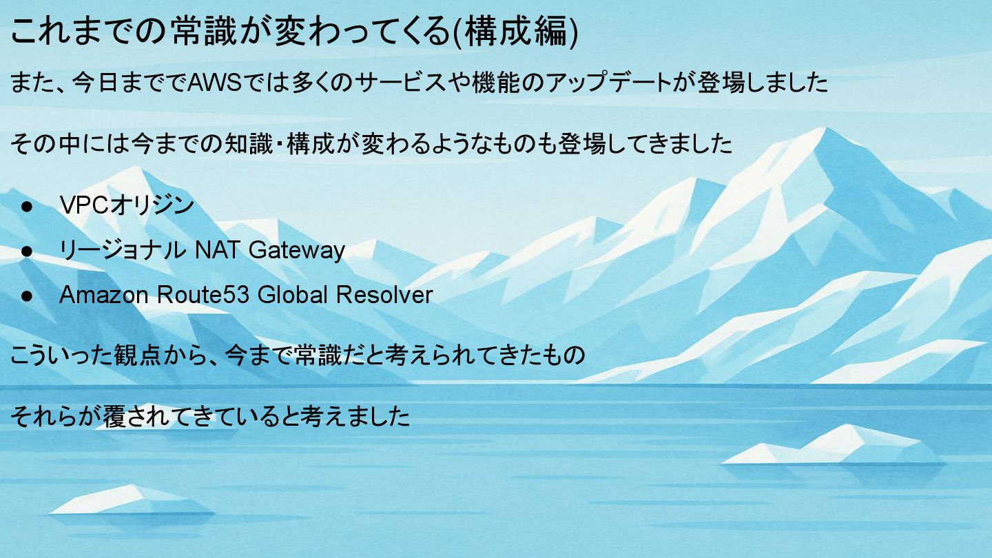 これまでの常識が変わってくる(構成編) また、今日まででAWSでは多くのサービスや機能のアップデートが登場しました その中には今までの知識・構成が変わるようなものも登場してきました • VPCオリジン • リージョナル NAT Gateway •