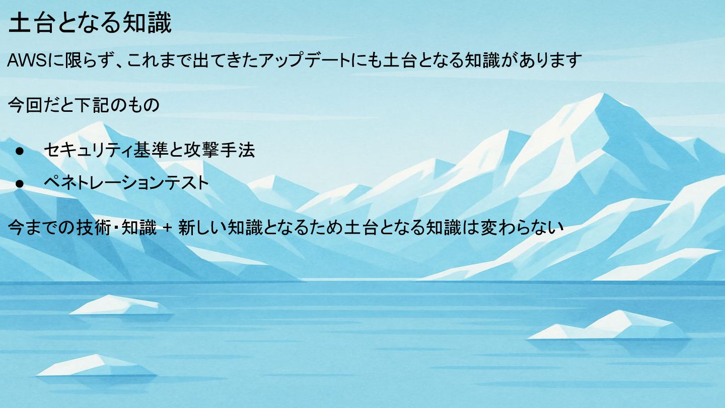土台となる知識 AWSに限らず、これまで出てきたアップデートにも土台となる知識があります 今回だと下記のもの • セキュリティ基準と攻撃手法 • ペネトレーションテスト 今までの技術・知識 + 新しい知識となるため土台となる知識は変わらない