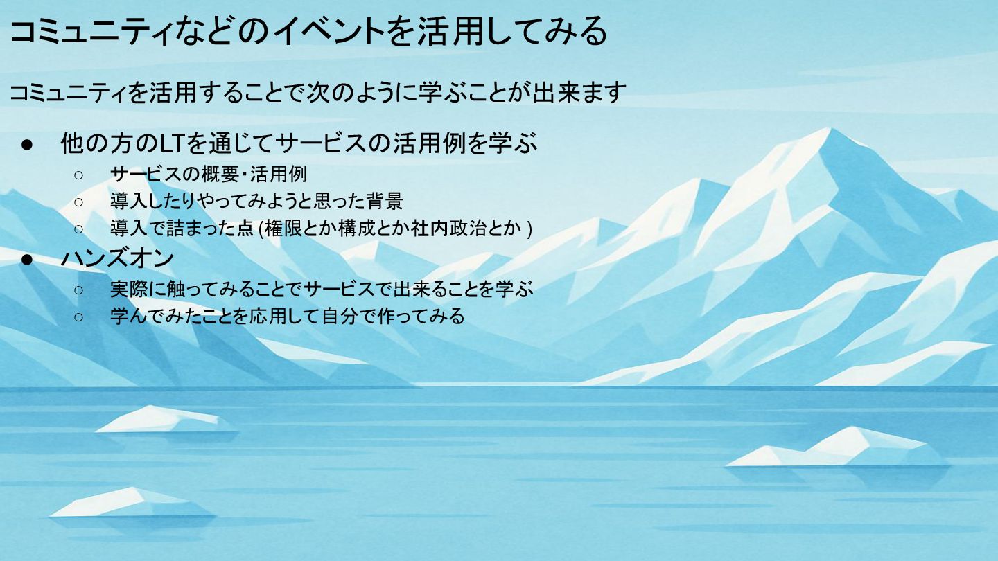 コミュニティなどのイベントを活用してみる コミュニティを活用することで次のように学ぶことが出来ます • 他の方のLTを通じてサービスの活用例を学ぶ ◦ サービスの概要・活用例 ◦ 導入したりやってみようと思った背景 ◦ 導入で詰まった点(権限とか構成とか社内政治とか