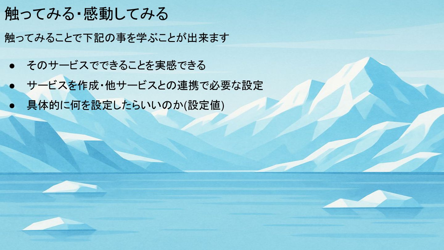 触ってみる・感動してみる 触ってみることで下記の事を学ぶことが出来ます • そのサービスでできることを実感できる • サービスを作成・他サービスとの連携で必要な設定 • 具体的に何を設定したらいいのか(設定値)