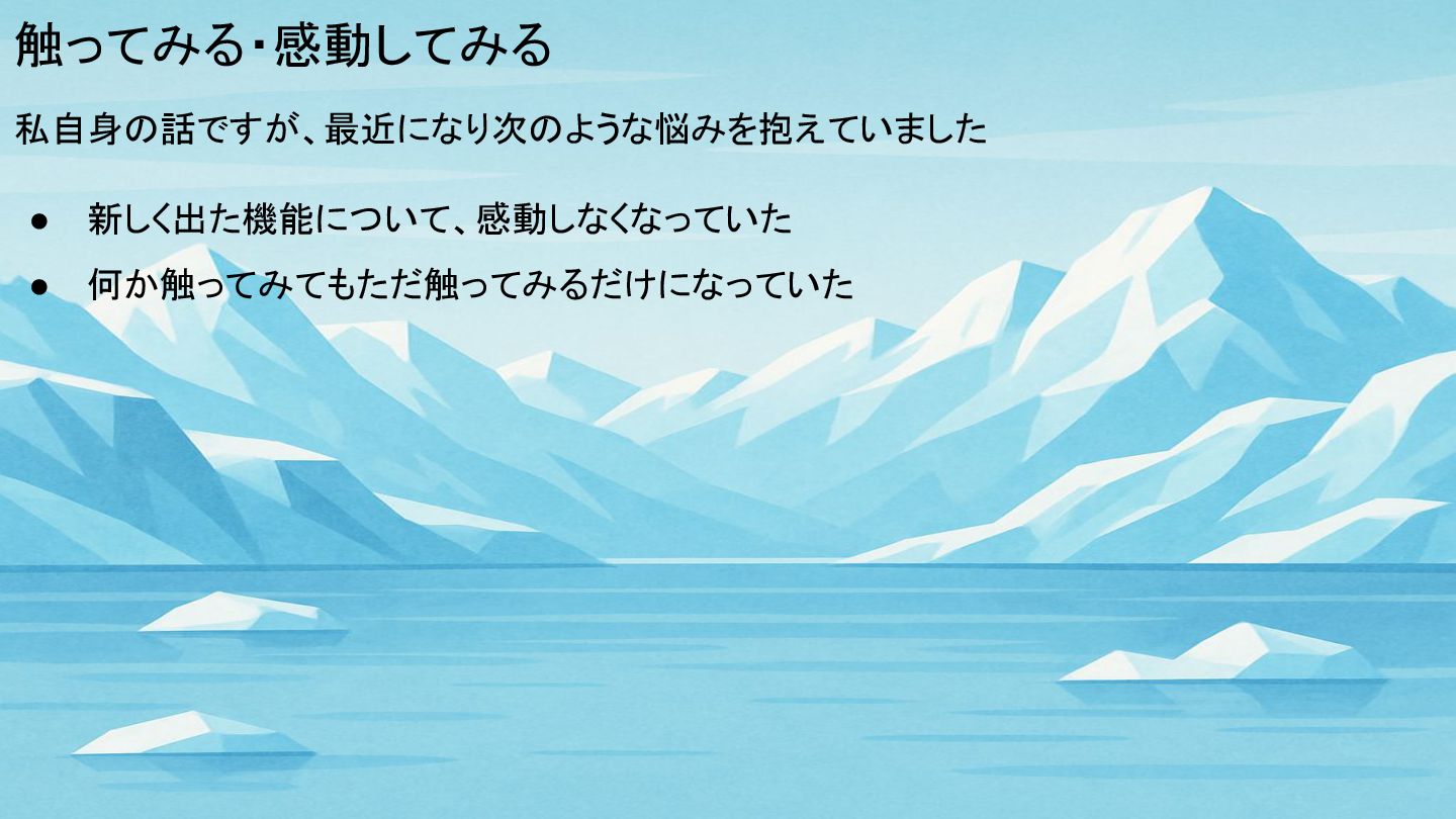触ってみる・感動してみる 私自身の話ですが、最近になり次のような悩みを抱えていました • 新しく出た機能について、感動しなくなっていた • 何か触ってみてもただ触ってみるだけになっていた
