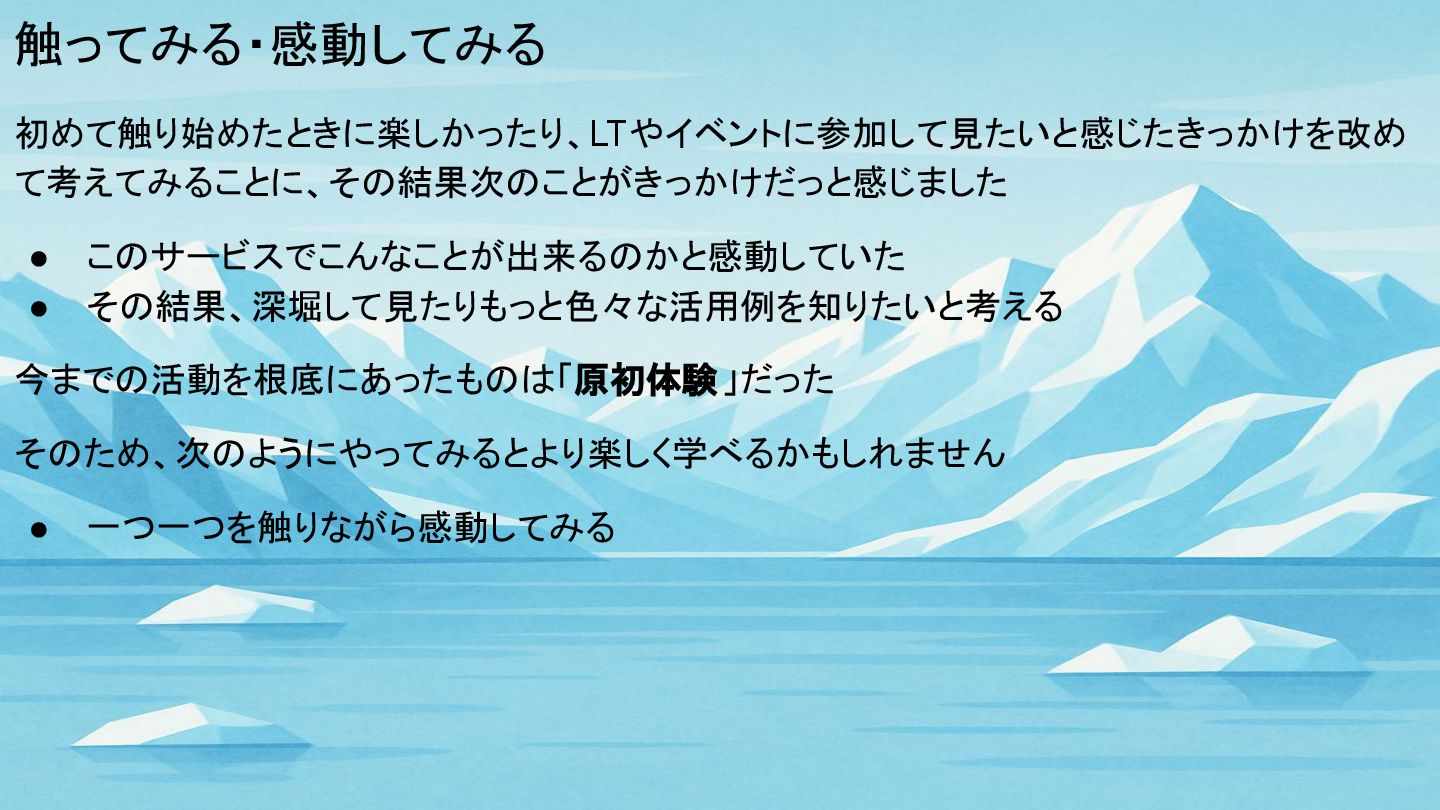 触ってみる・感動してみる 初めて触り始めたときに楽しかったり、LTやイベントに参加して見たいと感じたきっかけを改め て考えてみることに、その結果次のことがきっかけだっと感じました • このサービスでこんなことが出来るのかと感動していた • その結果、深堀して見たりもっと色々な活用例を知りたいと考える 今までの活動を根底にあったものは「原初体験」だった そのため、次のようにやってみるとより楽しく学べるかもしれません •
