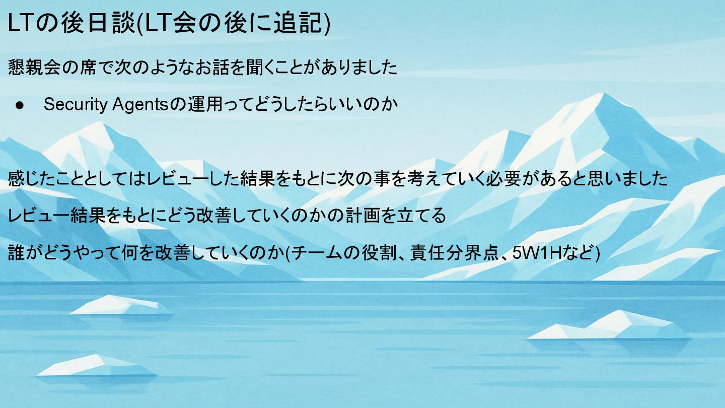 LTの後日談(LT会の後に追記) 懇親会の席で次のようなお話を聞くことがありました • Security Agentsの運用ってどうしたらいいのか 感じたこととしてはレビューした結果をもとに次の事を考えていく必要があると思いました レビュー結果をもとにどう改善していくのかの計画を立てる 誰がどうやって何を改善していくのか(チームの役割、責任分界点、5W1Hなど)