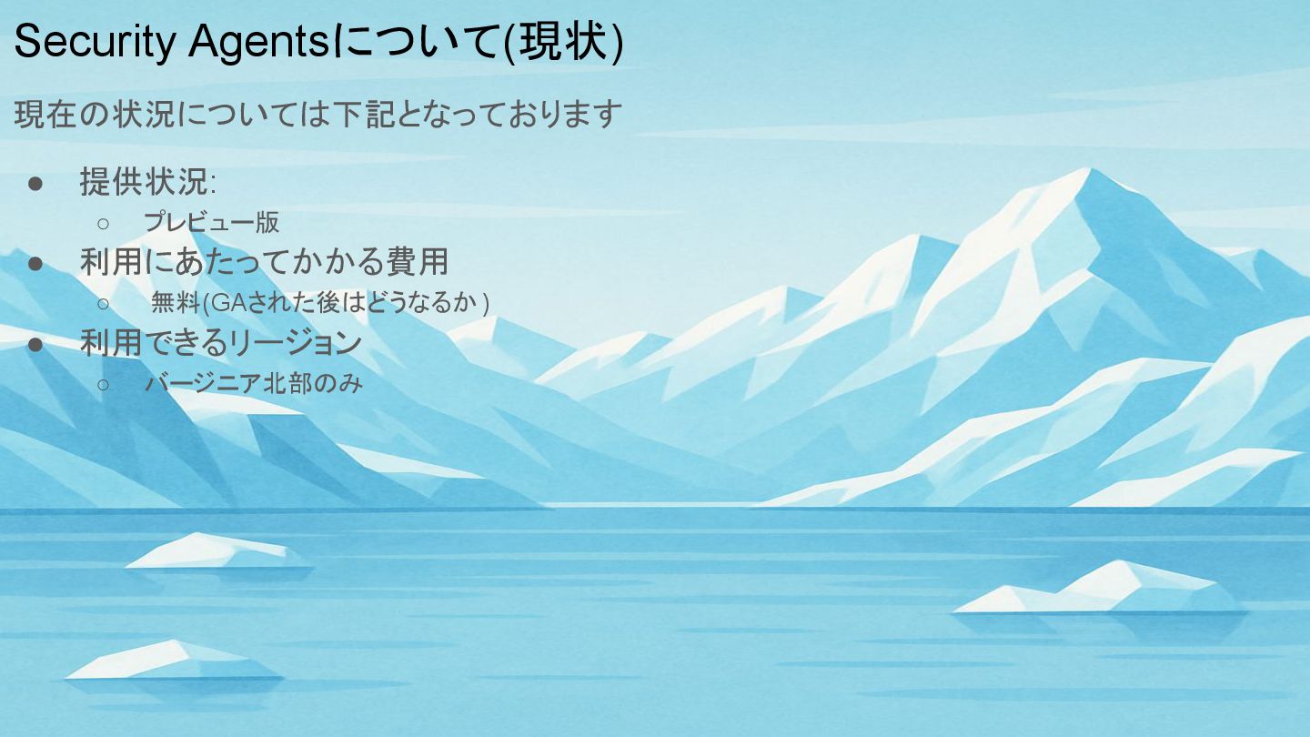 Security Agentsについて(現状) 現在の状況については下記となっております • 提供状況: ◦ プレビュー版 • 利用にあたってかかる費用 ◦
