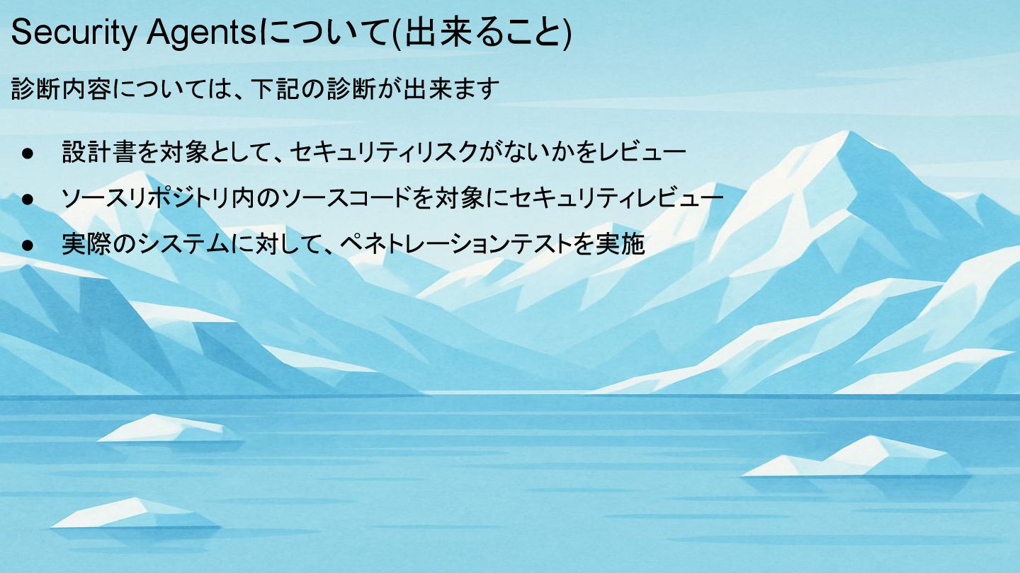 Security Agentsについて(出来ること) 診断内容については、下記の診断が出来ます • 設計書を対象として、セキュリティリスクがないかをレビュー • ソースリポジトリ内のソースコードを対象にセキュリティレビュー • 実際のシステムに対して、ペネトレーションテストを実施