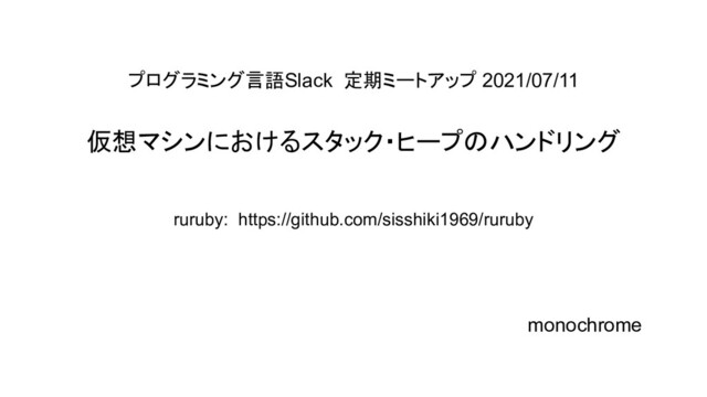 プログラミング言語Slack 定期ミートアップ 2021/07/11 仮想マシンにおけるスタック・ヒープのハンドリング monochrome ruruby: https://github.com/sisshiki1969/ruruby
