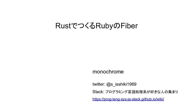 RustでつくるRubyのFiber monochrome twitter: @s_isshiki1969 Slack: プログラミング言語処理系が好きな人の集まり https://prog-lang-sys-ja-slack.github.io/wiki/