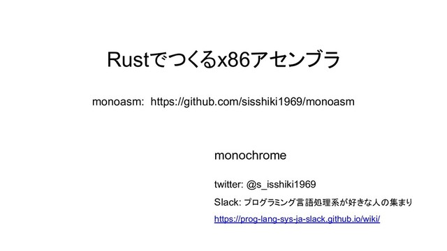 Rustでつくるx86アセンブラ monochrome twitter: @s_isshiki1969 Slack: プログラミング言語処理系が好きな人の集まり https://prog-lang-sys-ja-slack.github.io/wiki/ monoasm: https://github.com/sisshiki1969/monoasm