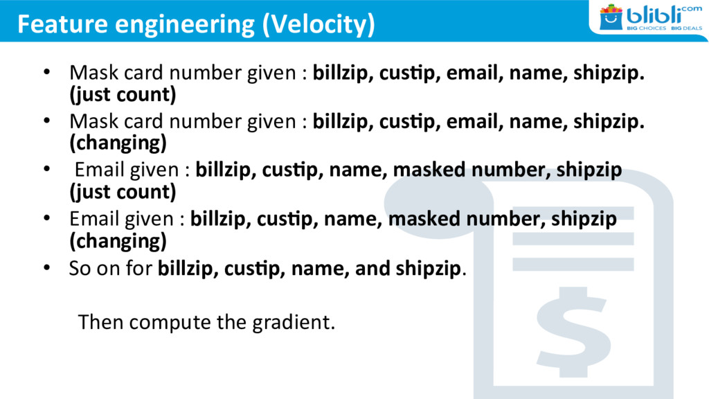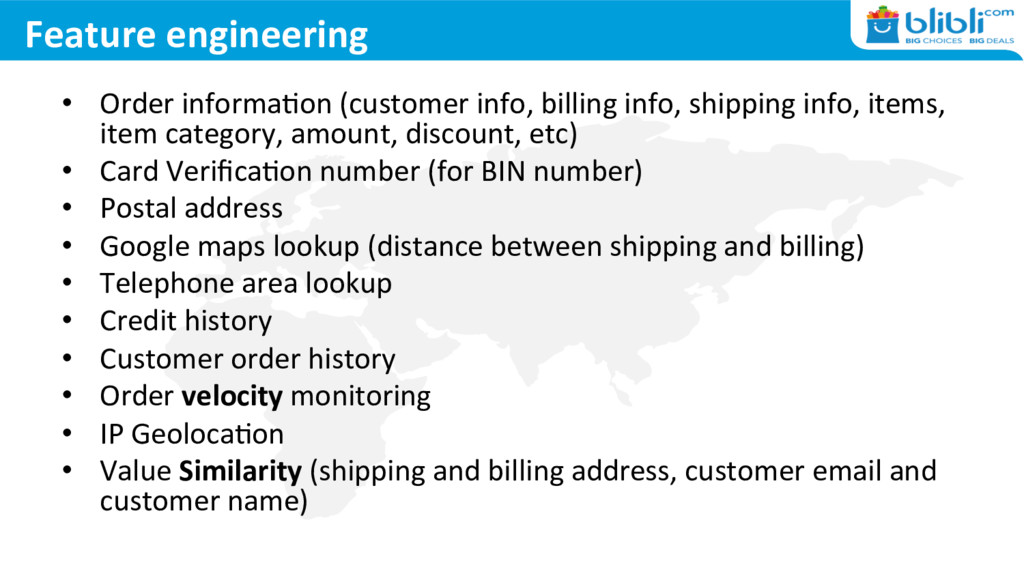 info, items, item category, amount, discount, etc) • Card VerificaUon number (for BIN number) • Postal address • Google maps lookup (distance between shipping and billing) • Telephone area lookup • Credit history • Customer order history • Order velocity monitoring • IP GeolocaUon • Value Similarity (shipping and billing address, customer email and customer name)