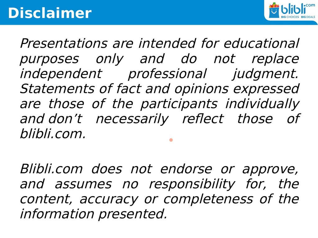 not replace independent professional judgment. Statements of fact and opinions expressed are those of the participants individually and don’t necessarily reflect those of blibli.com. Blibli.com does not endorse or approve, and assumes no responsibility for, the content, accuracy or completeness of the information presented.
