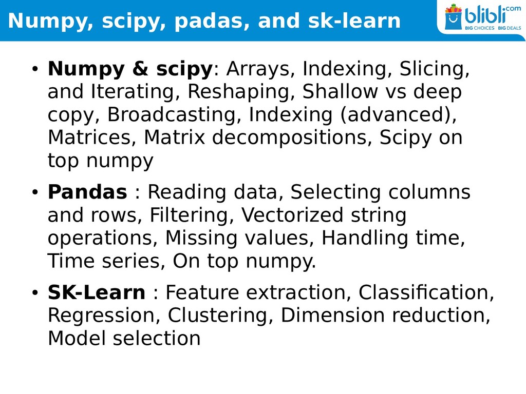 Indexing, Slicing, and Iterating, Reshaping, Shallow vs deep copy, Broadcasting, Indexing (advanced), Matrices, Matrix decompositions, Scipy on top numpy • Pandas : Reading data, Selecting columns and rows, Filtering, Vectorized string operations, Missing values, Handling time, Time series, On top numpy. • SK-Learn : Feature extraction, Classification, Regression, Clustering, Dimension reduction, Model selection