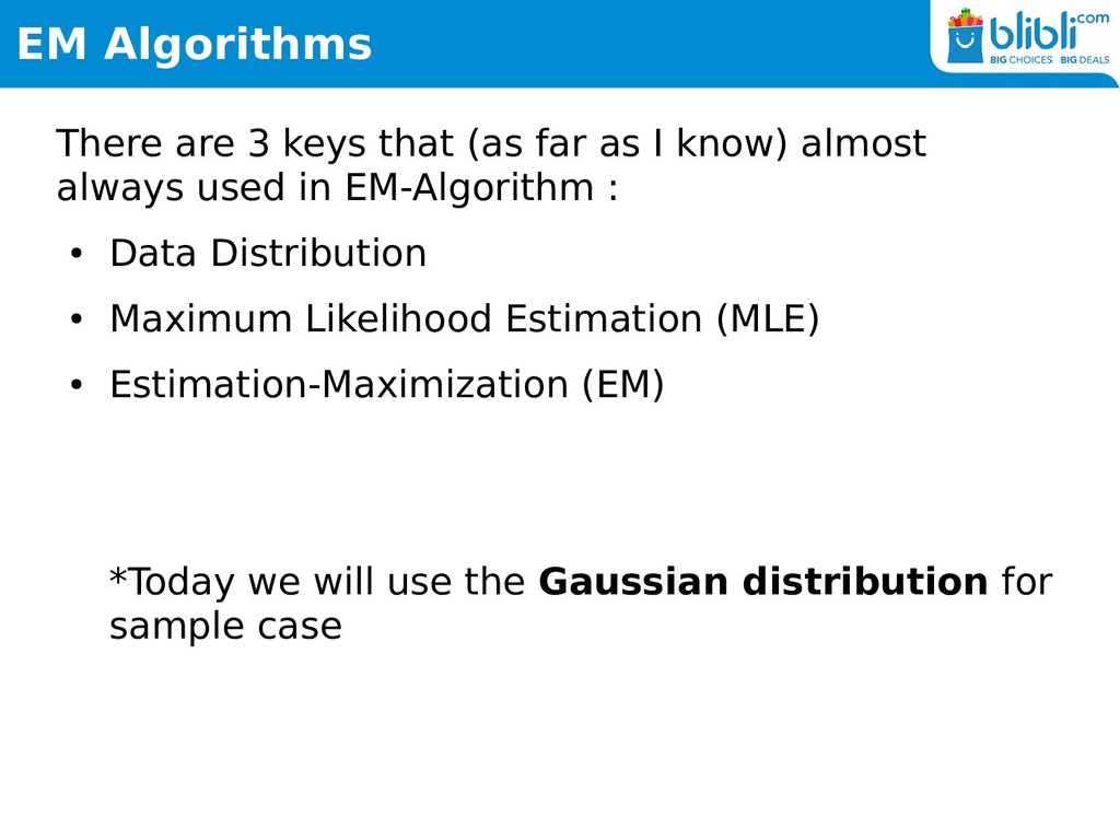I know) almost always used in EM-Algorithm : • Data Distribution • Maximum Likelihood Estimation (MLE) • Estimation-Maximization (EM) *Today we will use the Gaussian distribution for sample case