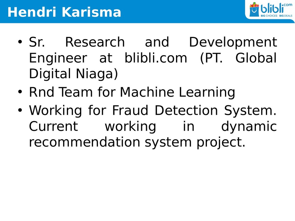 (PT. Global Digital Niaga) • Rnd Team for Machine Learning • Working for Fraud Detection System. Current working in dynamic recommendation system project.