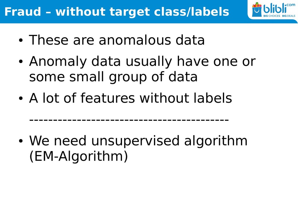 • Anomaly data usually have one or some small group of data • A lot of features without labels ------------------------------------------ • We need unsupervised algorithm (EM-Algorithm)