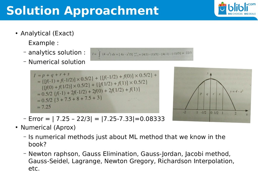 : – Numerical solution – Error = | 7.25 – 22/3| = |7.25-7.33|=0.08333 • Numerical (Aprox) – Is numerical methods just about ML method that we know in the book? – Newton raphson, Gauss Elimination, Gauss-Jordan, Jacobi method, Gauss-Seidel, Lagrange, Newton Gregory, Richardson Interpolation, etc.