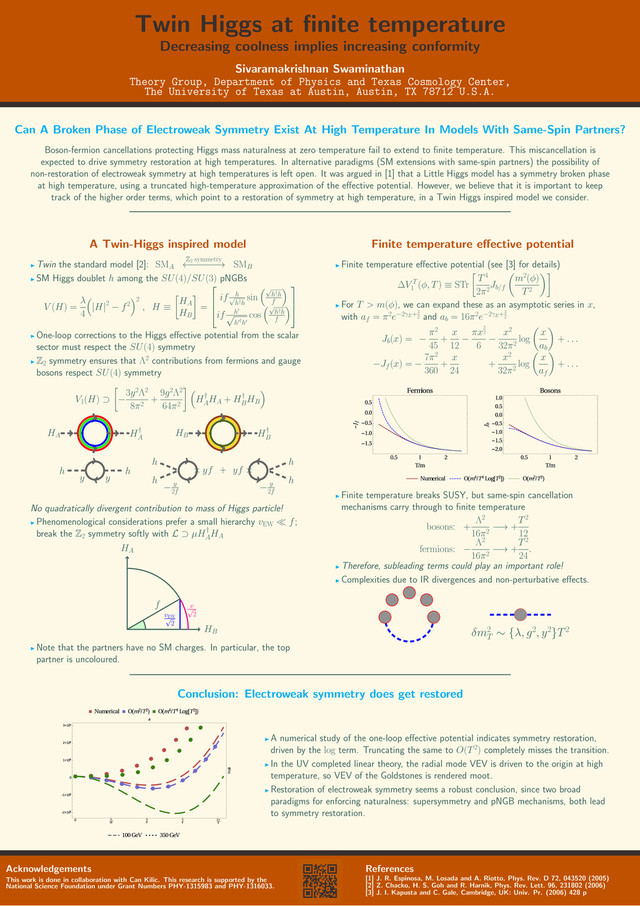 Sivaramakrishnan Swaminathan Theory Group, Department of Physics and Texas Cosmology Center, The University of Texas at Austin, Austin, TX 78712 U.S.A. Acknowledgements This work is done in collaboration with Can Kilic. This research is supported by the National Science Foundation under Grant Numbers PHY-1315983 and PHY-1316033. References [1] J. R. Espinosa, M. Losada and A. Riotto, Phys. Rev. D 72, 043520 (2005) [2] Z. Chacko, H. S. Goh and R. Harnik, Phys. Rev. Lett. 96, 231802 (2006) [3] J. I. Kapusta and C. Gale, Cambridge, UK: Univ. Pr. (2006) 428 p Can A Broken Phase of Electroweak Symmetry Exist At High Temperature In Models With Same-Spin Partners? Boson-fermion cancellations protecting Higgs mass naturalness at zero temperature fail to extend to finite temperature. This miscancellation is expected to drive symmetry restoration at high temperatures. In alternative paradigms (SM extensions with same-spin partners) the possibility of non-restoration of electroweak symmetry at high temperatures is left open. It was argued in [1] that a Little Higgs model has a symmetry broken phase at high temperature, using a truncated high-temperature approximation of the effective potential. However, we believe that it is important to keep track of the higher order terms, which point to a restoration of symmetry at high temperature, in a Twin Higgs inspired model we consider. A Twin-Higgs inspired model Twin the standard model [2]: SMA Z2 symmetry ← − − − − − → SMB SM Higgs doublet h among the SU(4)/SU(3) pNGBs V (H) = λ 4 |H|2 − f2 2 , H ≡ HA HB = if h √ h†h sin √ h†h f if h √ h †h cos √ h†h f One-loop corrections to the Higgs effective potential from the scalar sector must respect the SU(4) symmetry Z2 symmetry ensures that Λ2 contributions from fermions and gauge bosons respect SU(4) symmetry V1 (H) ⊃ − 3y2Λ2 8π2 + 9g2Λ2 64π2 H† A HA + H† B HB HA H† A HB H† B h h y y h h × yf − y 2f + h h × yf − y 2f No quadratically divergent contribution to mass of Higgs particle! Phenomenological considerations prefer a small hierarchy vEW f; break the Z2 symmetry softly with L ⊃ µH† A HA HB HA vEW √ 2 v √ 2 f Note that the partners have no SM charges. In particular, the top partner is uncoloured. Finite temperature effective potential Finite temperature effective potential (see [3] for details) ∆V T 1 (φ, T) ≡ STr T4 2π2 Jb/f m2(φ) T2 For T > m(φ), we can expand these as an asymptotic series in x, with af = π2e−2γE+3 2 and ab = 16π2e−2γE+3 2 Jb (x) = − π2 45 + x 12 − πx3 2 6 − x2 32π2 log x ab + . . . −Jf (x) = − 7π2 360 + x 24 + x2 32π2 log x af + . . . Finite temperature breaks SUSY, but same-spin cancellation mechanisms carry through to finite temperature bosons: + Λ2 16π2 −→ + T2 12 fermions: − Λ2 16π2 −→ + T2 24 . Therefore, subleading terms could play an important role! Complexities due to IR divergences and non-perturbative effects. δm2 T ∼ {λ, g2, y2}T2 Conclusion: Electroweak symmetry does get restored A numerical study of the one-loop effective potential indicates symmetry restoration, driven by the log term. Truncating the same to O(T2) completely misses the transition. In the UV completed linear theory, the radial mode VEV is driven to the origin at high temperature, so VEV of the Goldstones is rendered moot. Restoration of electroweak symmetry seems a robust conclusion, since two broad paradigms for enforcing naturalness: supersymmetry and pNGB mechanisms, both lead to symmetry restoration.
