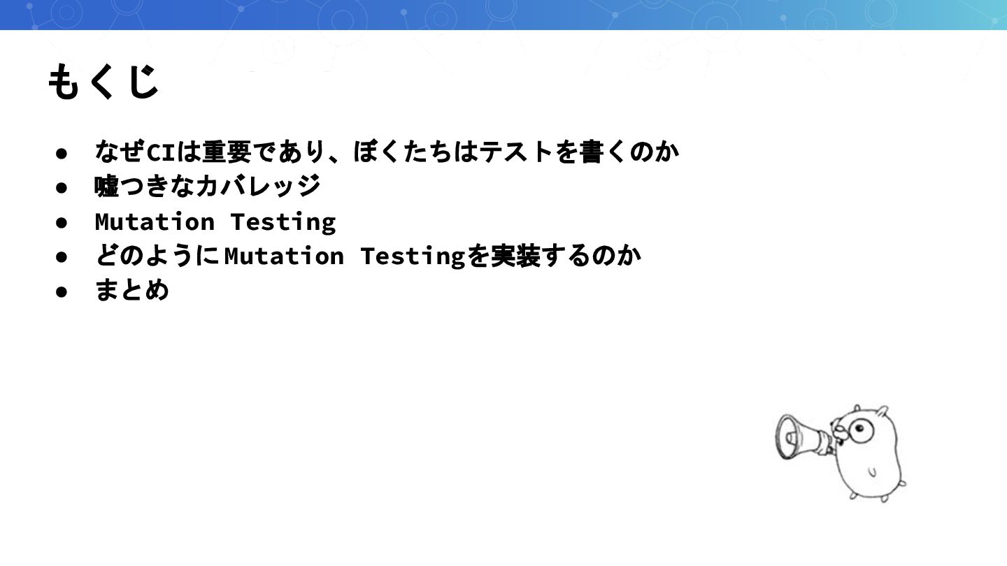 もくじ • なぜCIは重要であり、ぼくたちはテストを書くのか • 嘘つきなカバレッジ • Mutation Testing • どのように