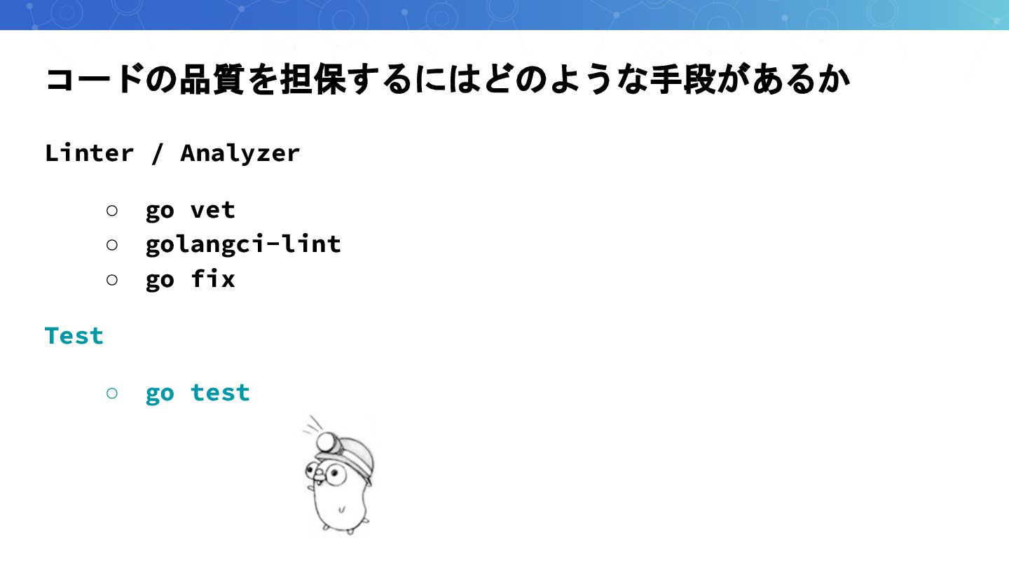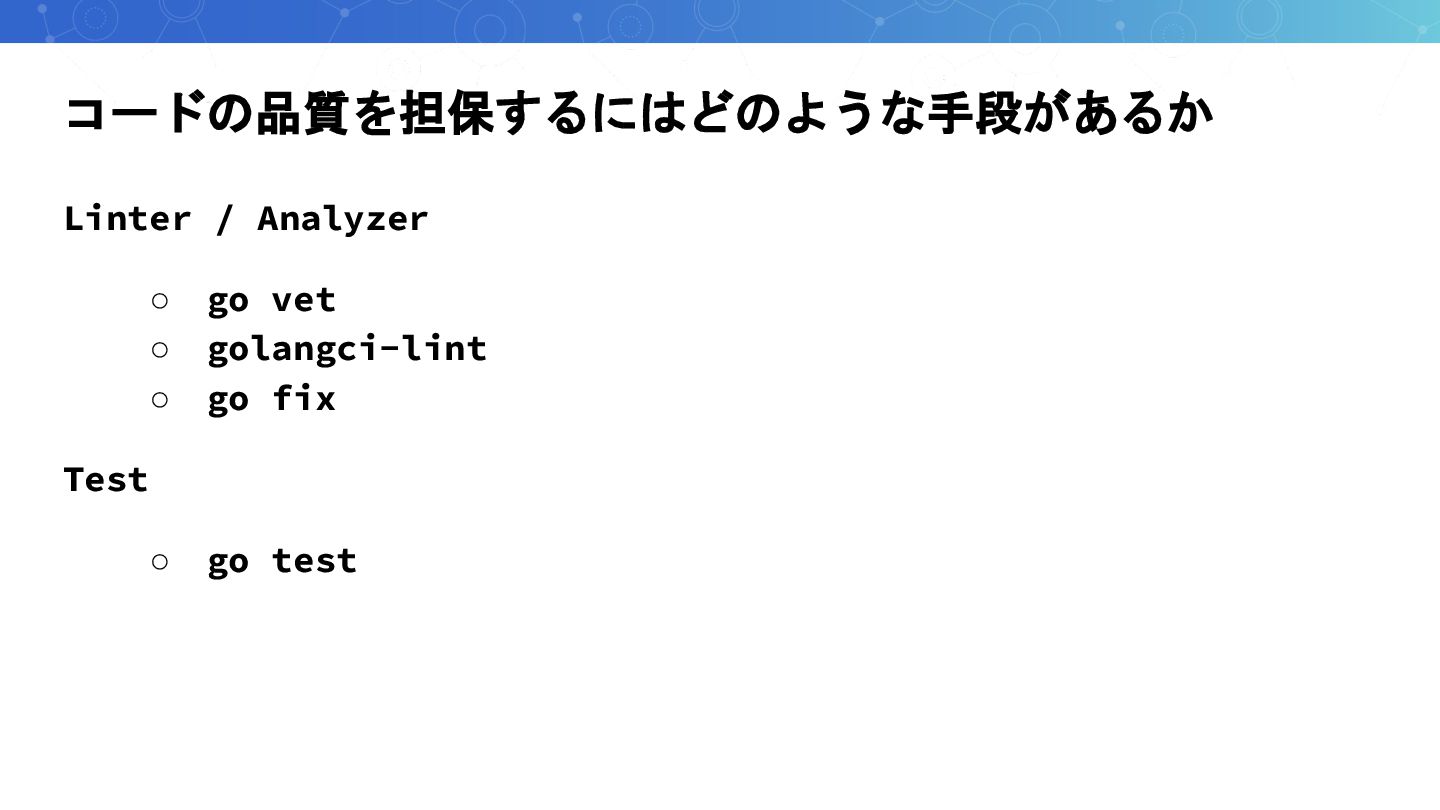コードの品質を担保するにはどのような手段があるか Linter / Analyzer ◦ go vet ◦ golangci-lint ◦
