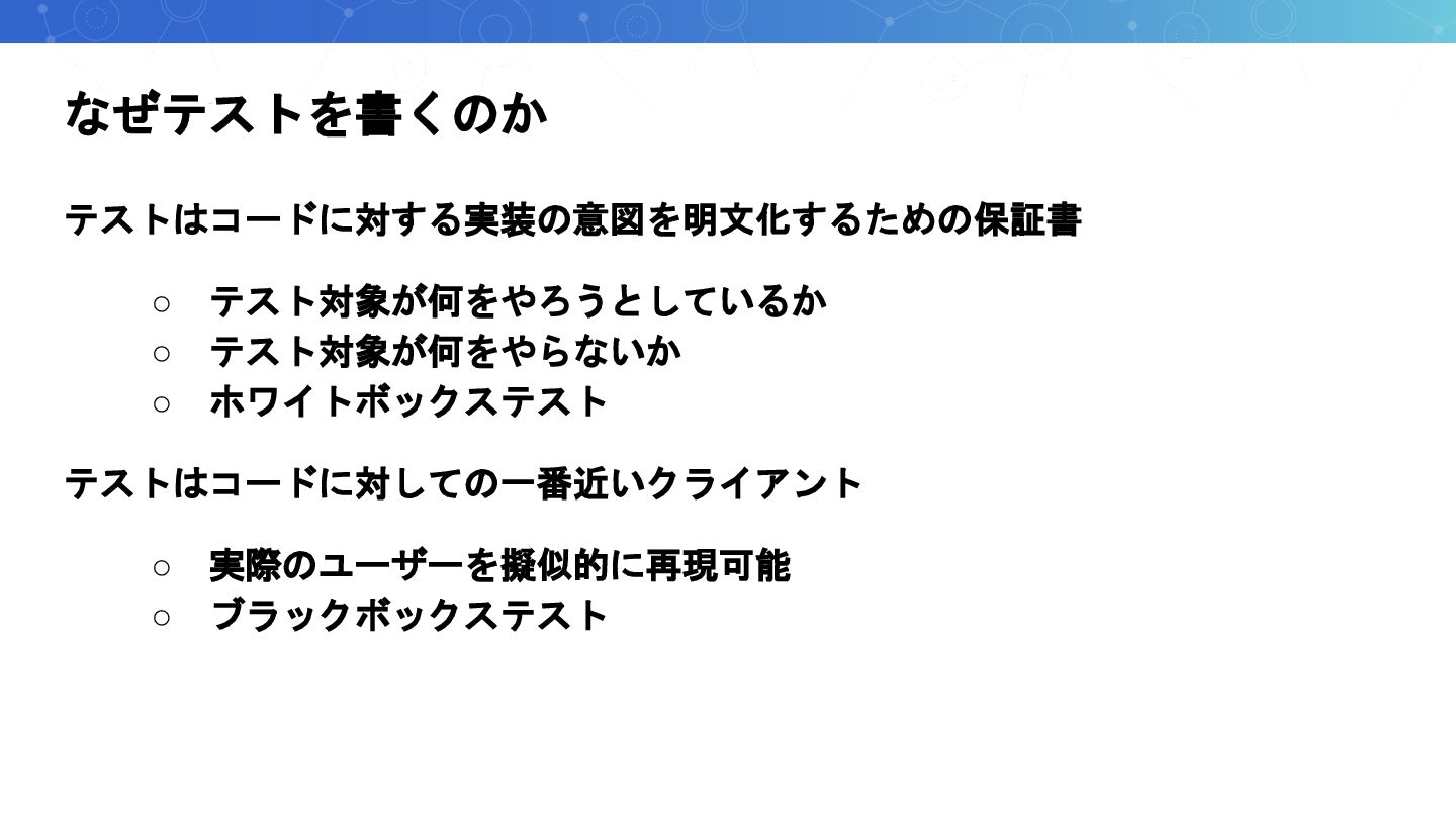 なぜテストを書くのか テストはコードに対する実装の意図を明文化するための保証書 ◦ テスト対象が何をやろうとしているか ◦ テスト対象が何をやらないか ◦ ホワイトボックステスト テストはコードに対しての一番近いクライアント ◦