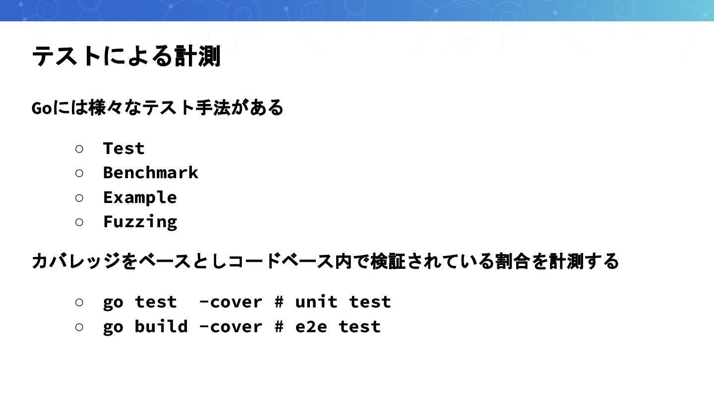 カバレッジをベースとしコードベース内で検証されている割合を計測する ◦ go test -cover # unit test ◦ go build -cover # e2e test