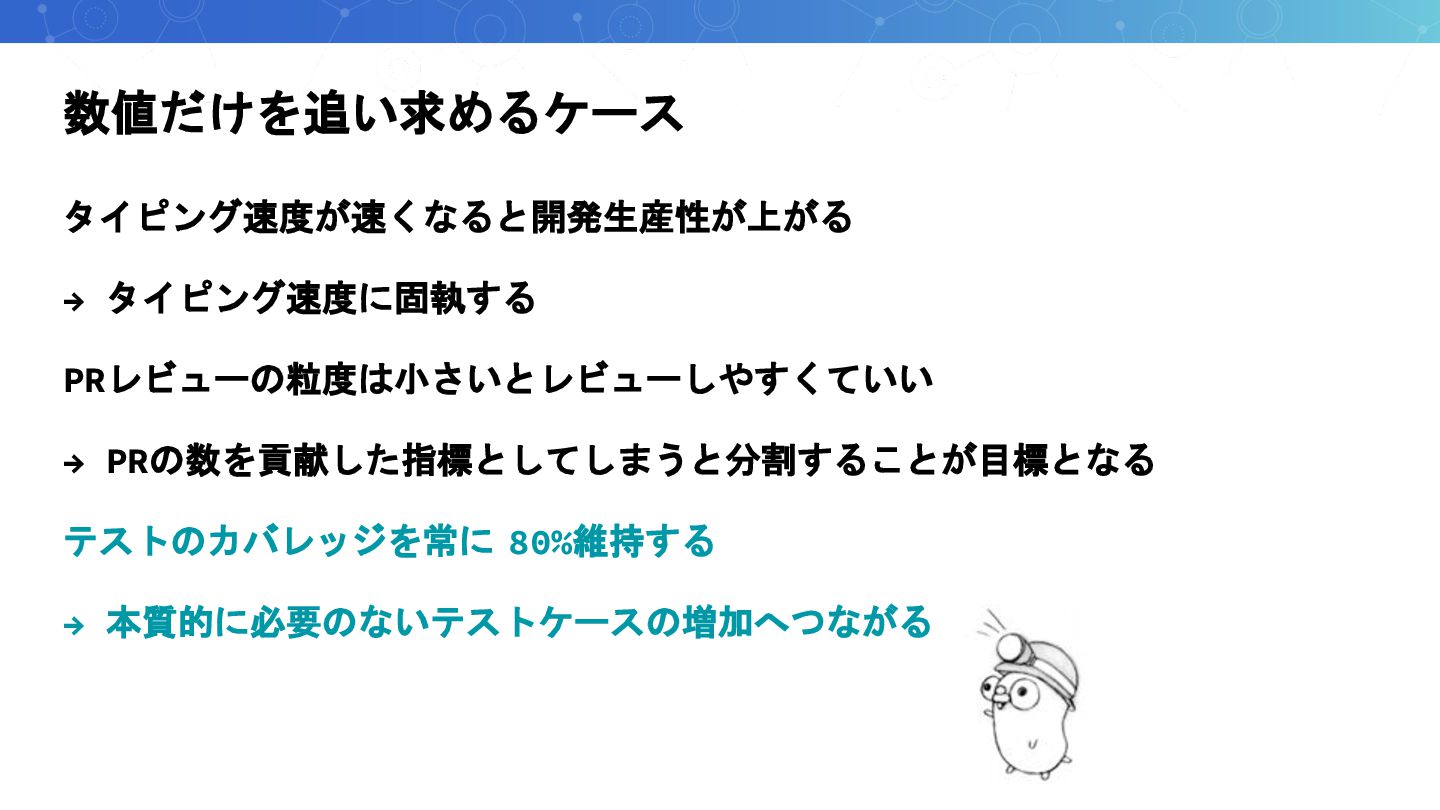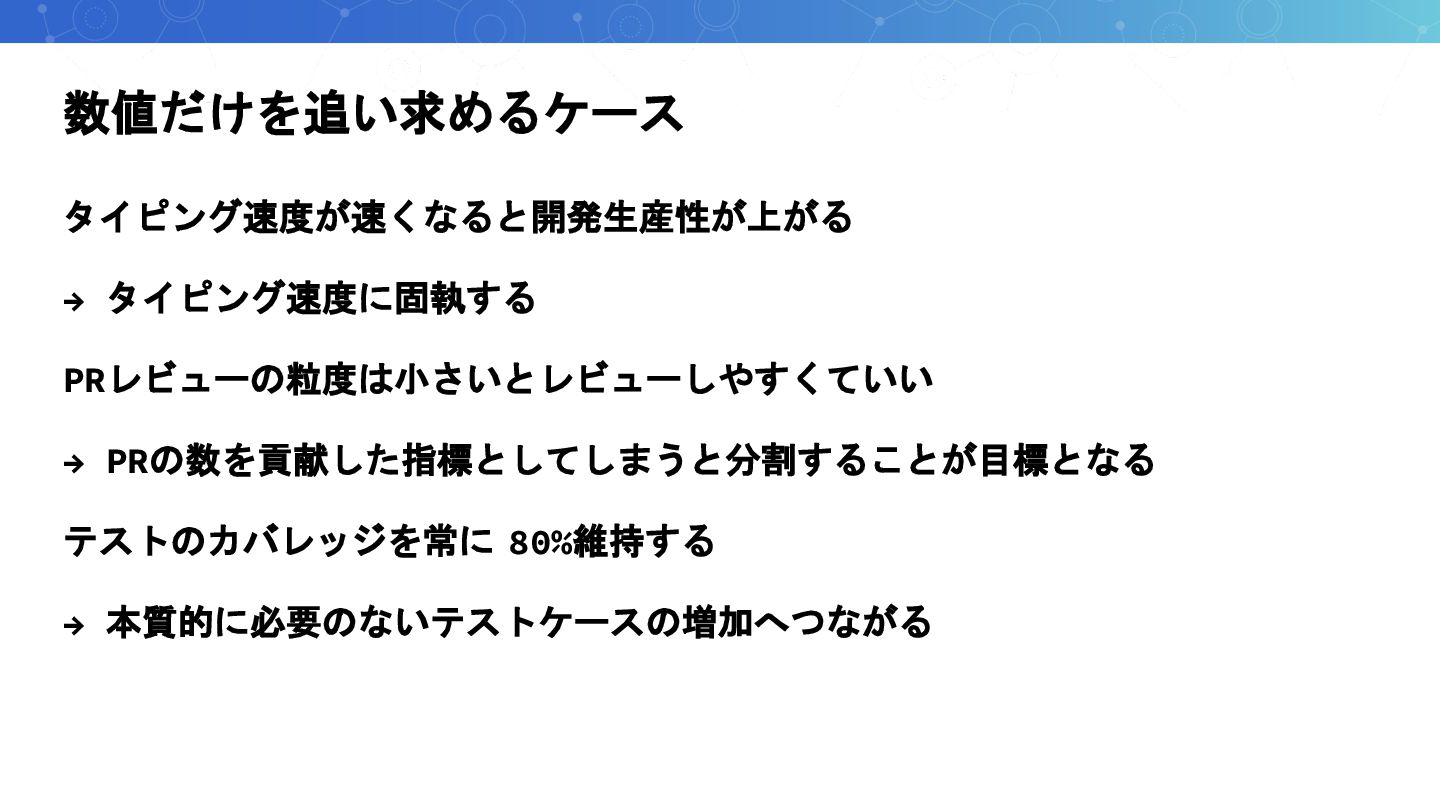 数値だけを追い求めるケース タイピング速度が速くなると開発生産性が上がる → タイピング速度に固執する PRレビューの粒度は小さいとレビューしやすくていい → PRの数を貢献した指標としてしまうと分割することが目標となる テストのカバレッジを常に 80%維持する →