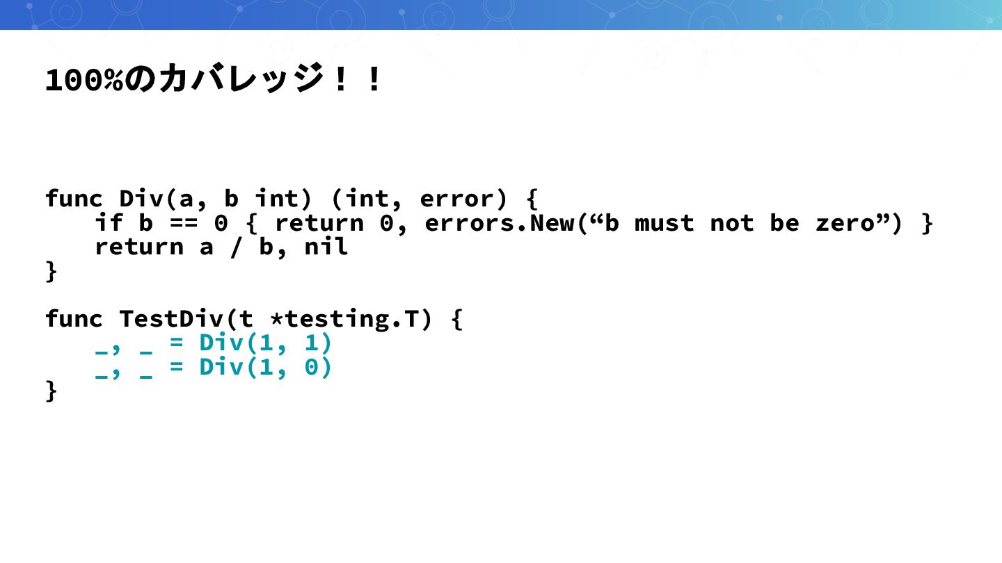 100%のカバレッジ!! func Div(a, b int) (int, error) { if b