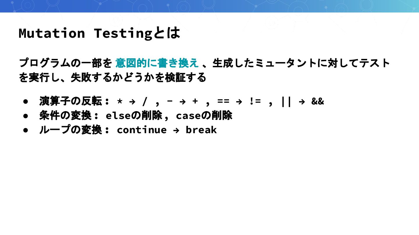 Mutation Testingとは プログラムの一部を 意図的に書き換え 、生成したミュータントに対してテスト を実行し、失敗するかどうかを検証する • 演算子の反転 : *