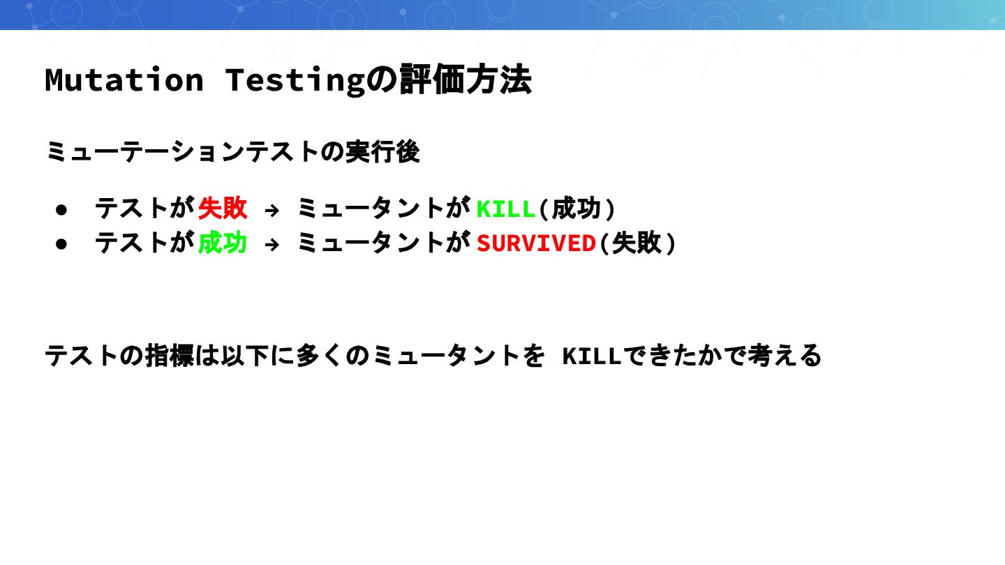 Mutation Testingの評価方法 ミューテーションテストの実行後 • テストが失敗 → ミュータントが KILL(成功) • テストが成功