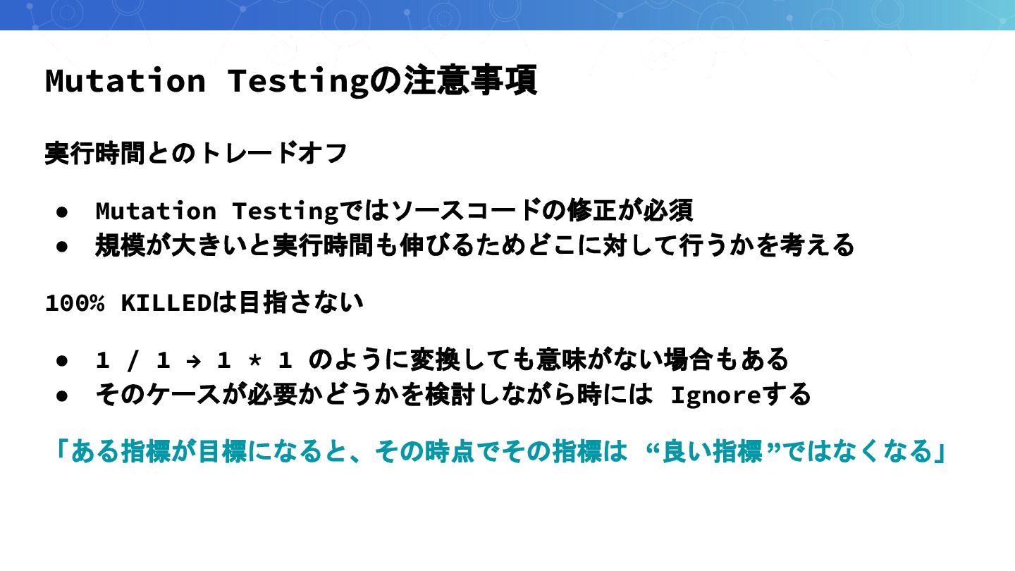 Mutation Testingの注意事項 実行時間とのトレードオフ • Mutation Testingではソースコードの修正が必須 • 規模が大きいと実行時間も伸びるためどこに対して行うかを考える 100% KILLEDは目指さない