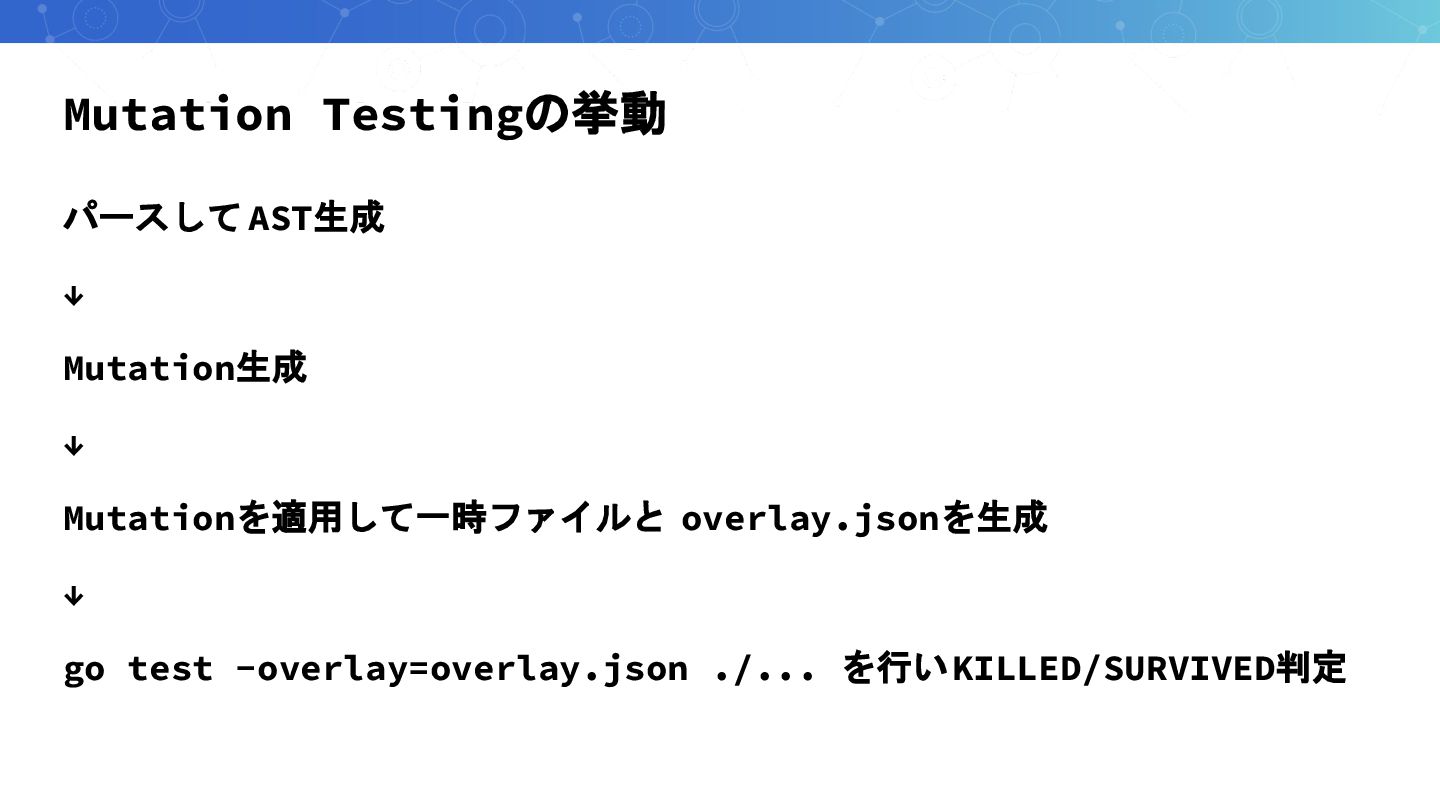 Mutation Testingの実装方法 sivchari/gomuの実装方法をベースとします GoのMutation Testingライブラリ overlayを活用しミューテーションテストを並列に実行する インクリメンタル解析を行い差分のみの Mutation Testingを実行可能 PRへのレポート生成と閾値以下のスコアで