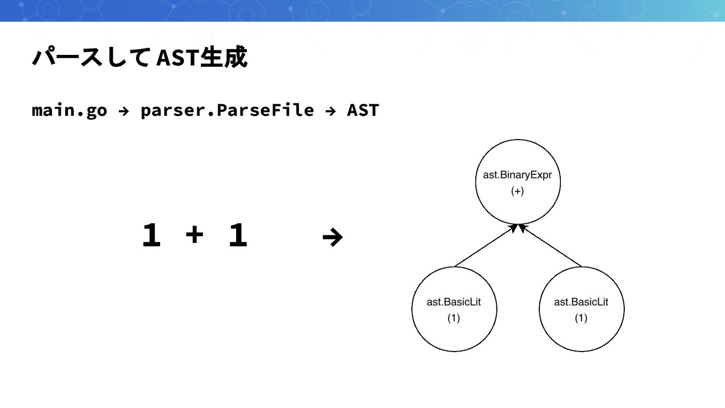 パースして AST生成 main.go → parser.ParseFile → AST 1 + 1