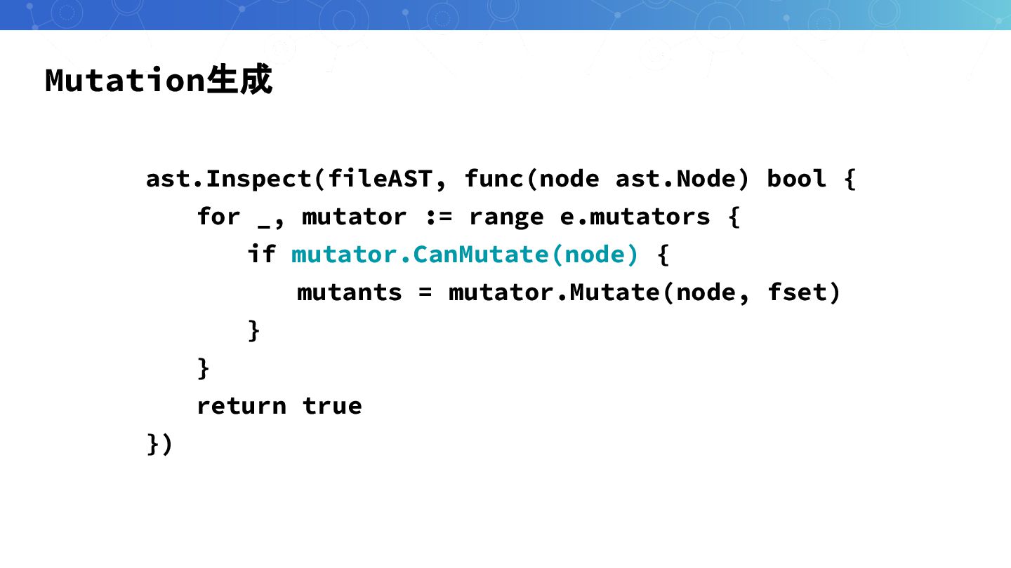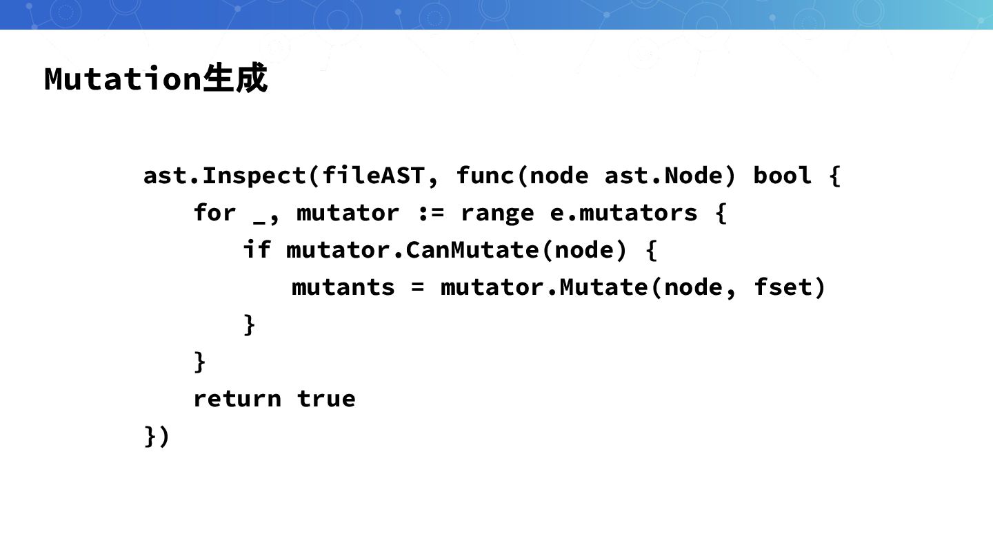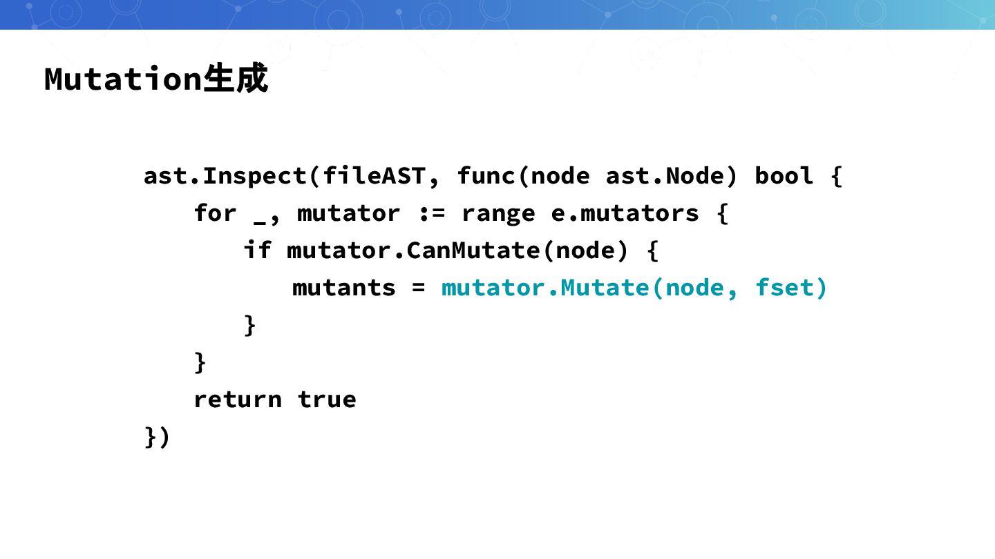 Mutation生成 ast.Inspect(fileAST, func(node ast.Node) bool { for _, mutator :=
