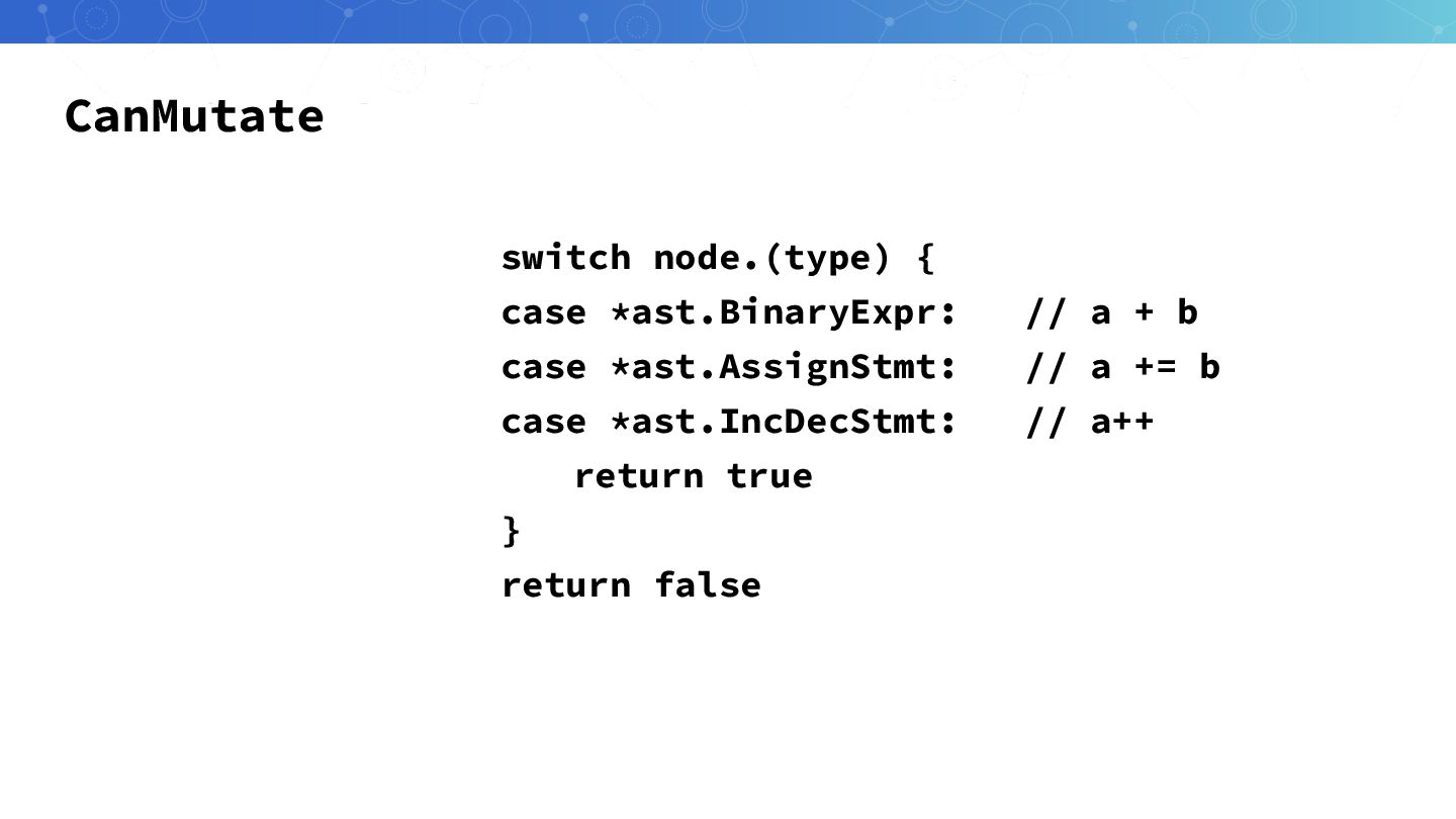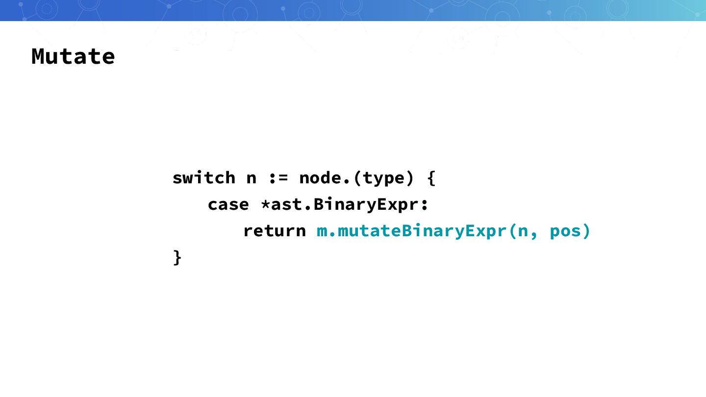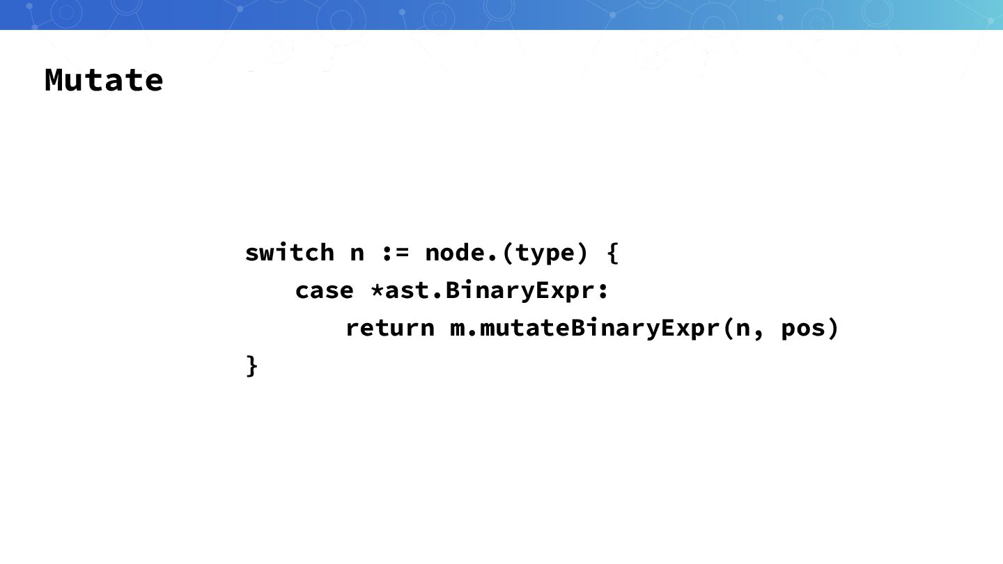 Mutation生成 ast.Inspect(fileAST, func(node ast.Node) bool { for _, mutator :=
