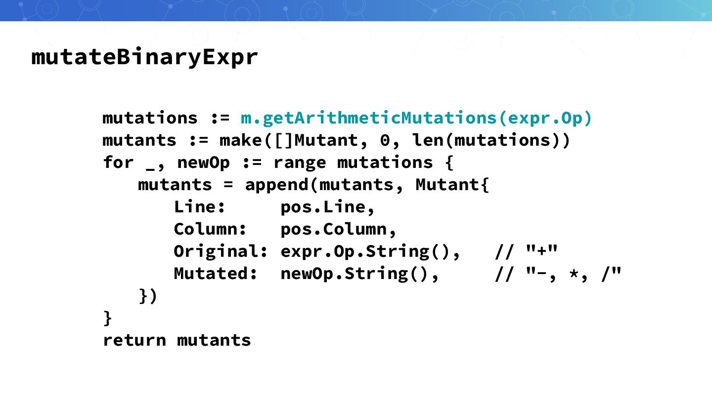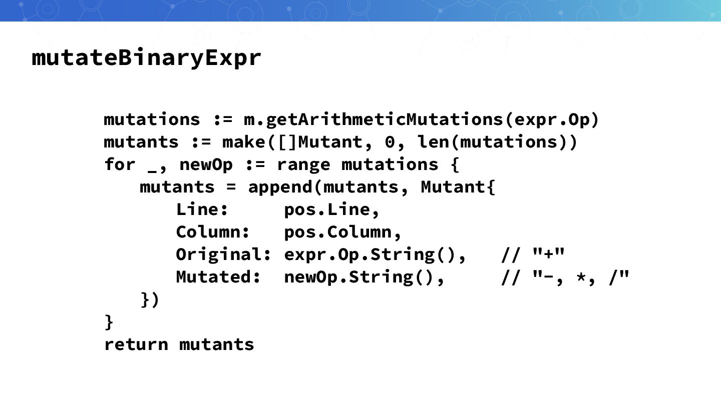 _, newOp := range mutations { mutants = append(mutants, Mutant{ Line: pos.Line, Column: pos.Column, Original: expr.Op.String(), // "+" Mutated: newOp.String(), // "-, *, /" }) } return mutants