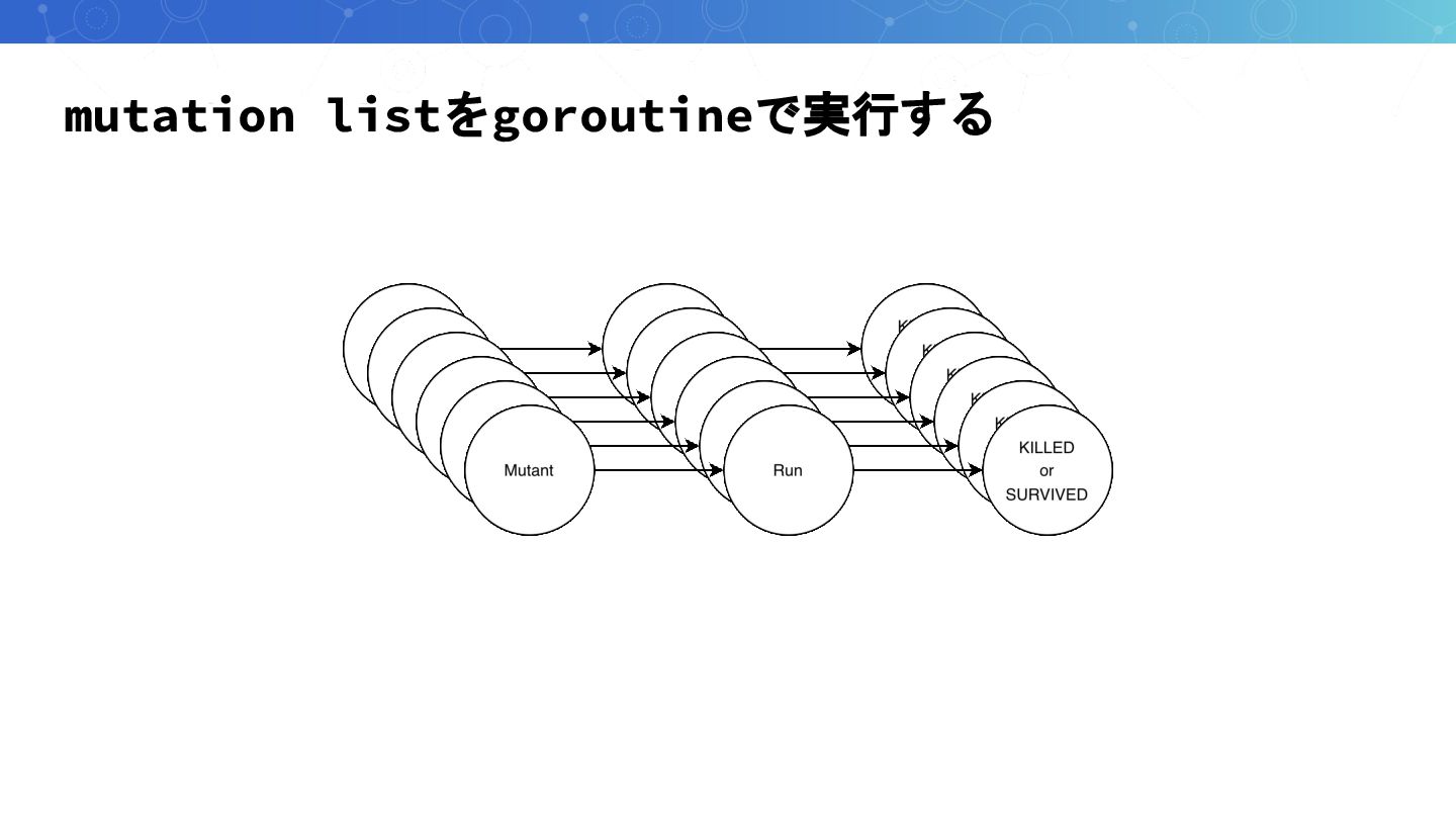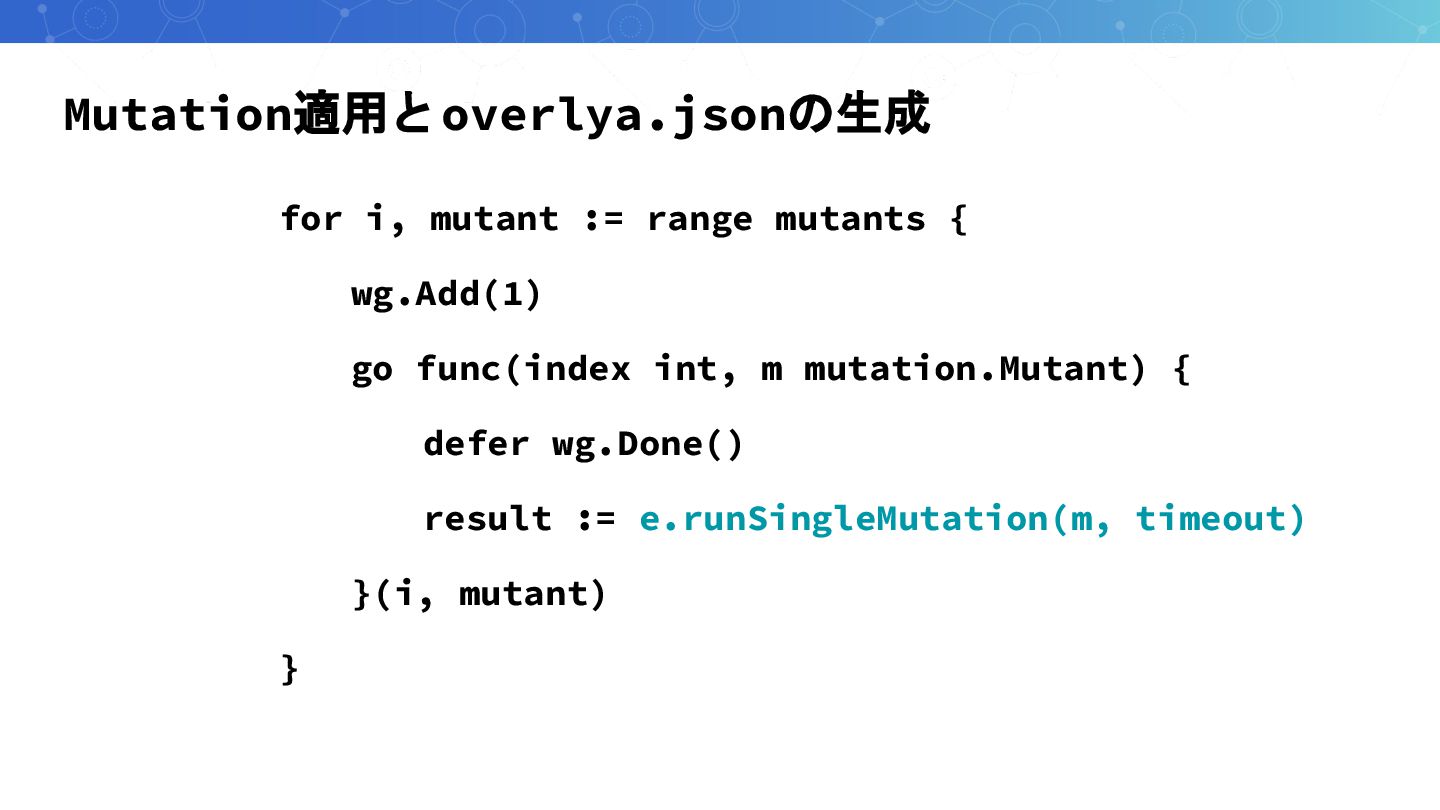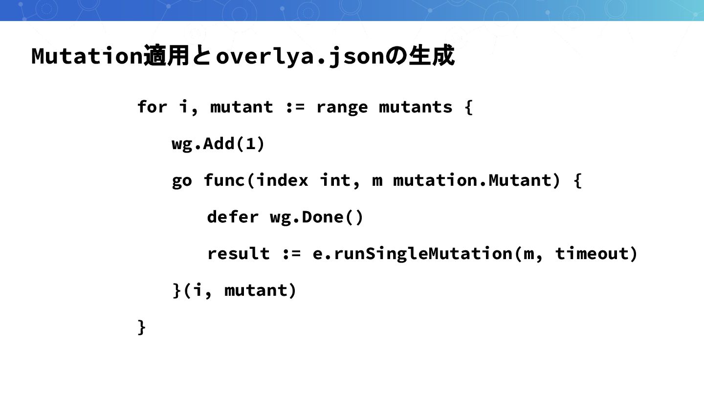 Mutation適用とoverlya.jsonの生成 for i, mutant := range mutants { wg.Add(1) go