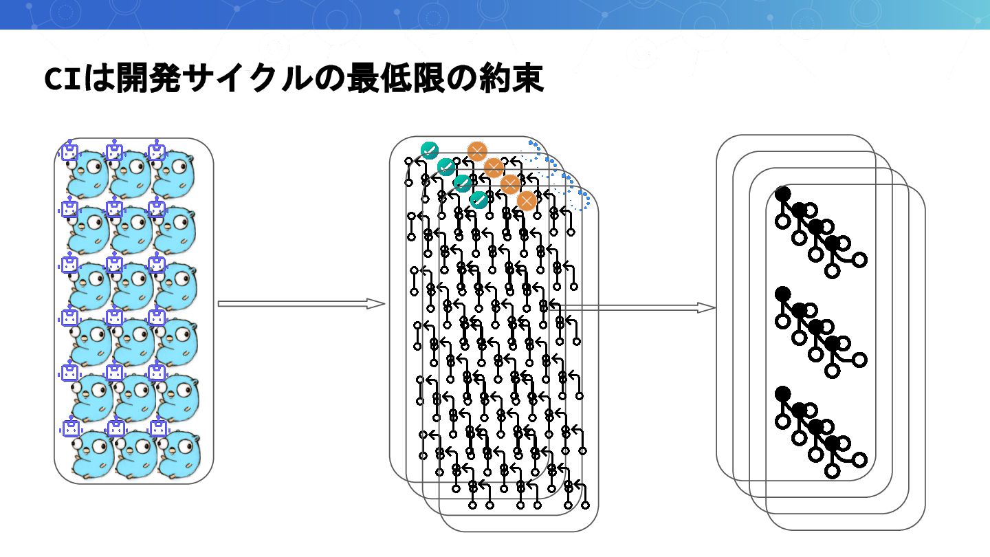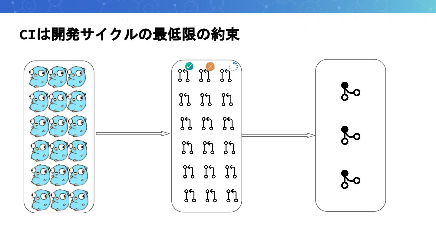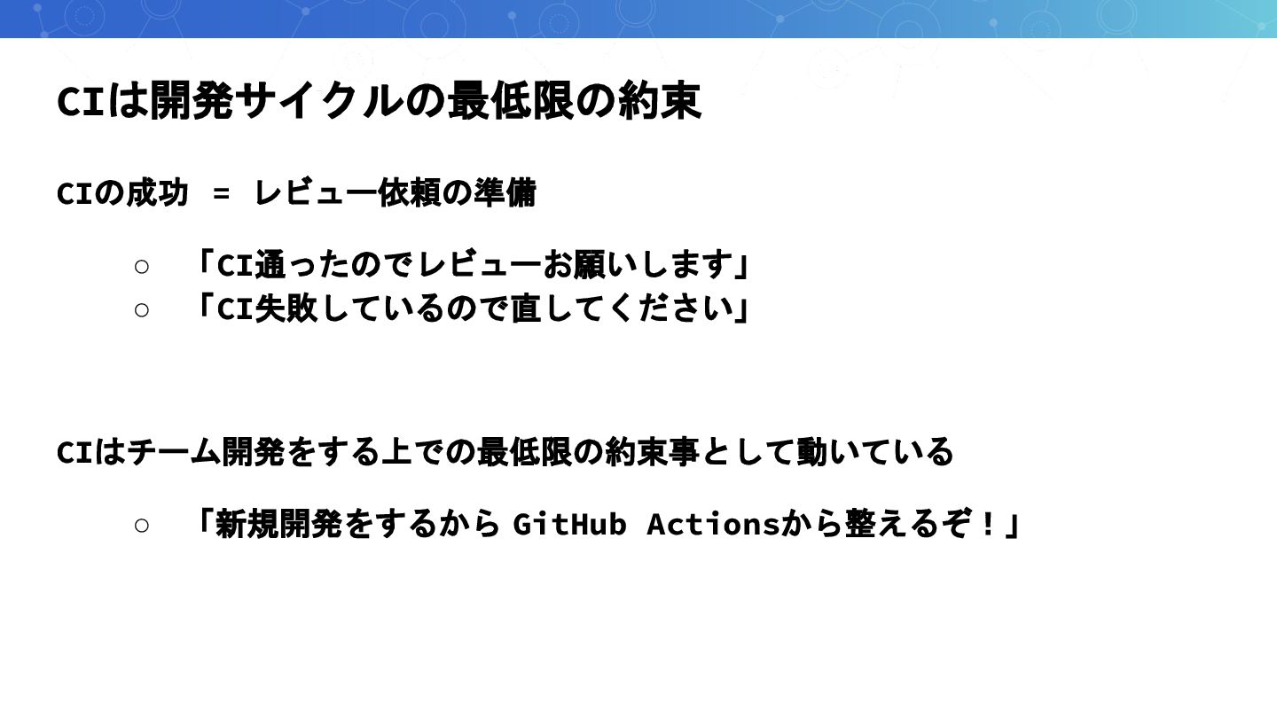 CIは開発サイクルの最低限の約束 CIの成功 = レビュー依頼の準備 ◦ 「CI通ったのでレビューお願いします」 ◦ 「CI失敗しているので直してください」 CIはチーム開発をする上での最低限の約束事として動いている ◦