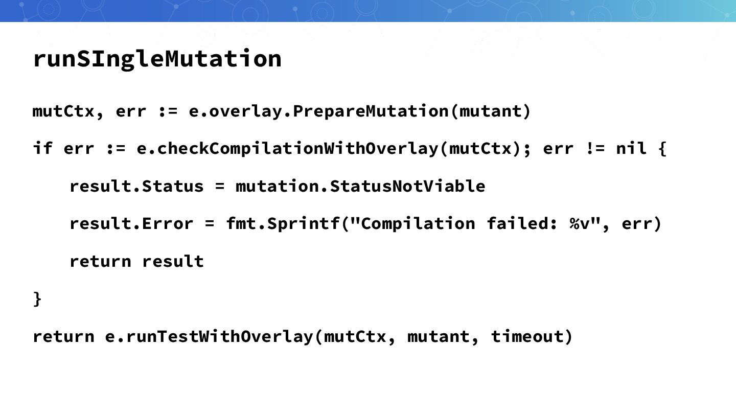 runSIngleMutation mutCtx, err := e.overlay.PrepareMutation(mutant) if err := e.checkCompilationWithOverlay(mutCtx); err