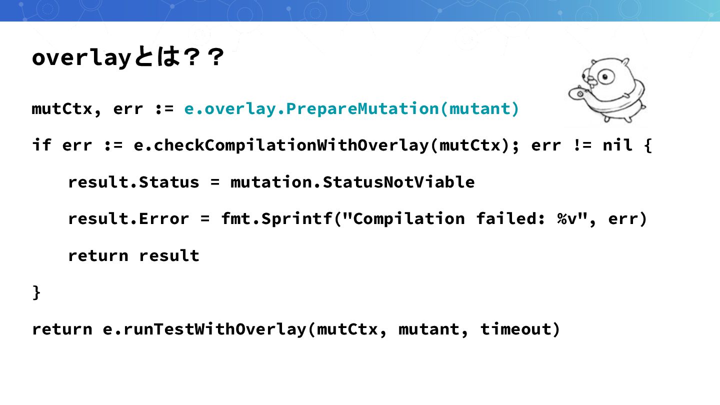 overlayとは?? mutCtx, err := e.overlay.PrepareMutation(mutant) if err := e.checkCompilationWithOverlay(mutCtx); err