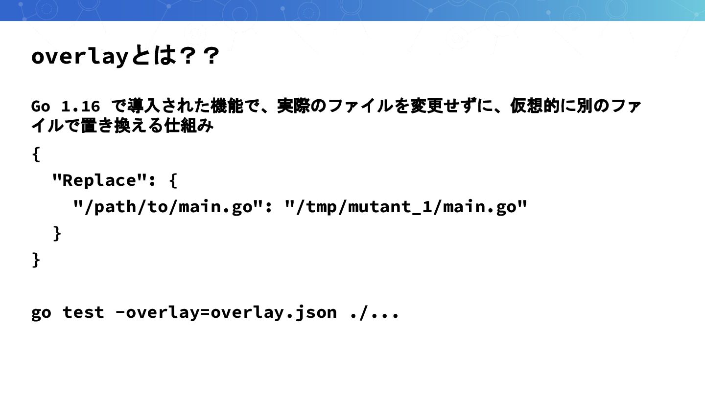 overlayとは?? Go 1.16 で導入された機能で、実際のファイルを変更せずに、仮想的に別のファ イルで置き換える仕組み { "Replace": { "/path/to/main.go": "/tmp/mutant_1/main.go"