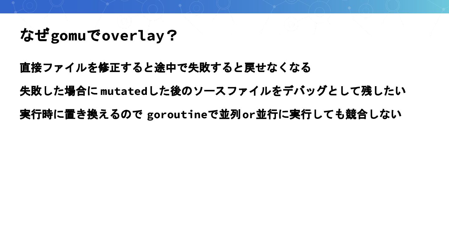 なぜgomuでoverlay? 直接ファイルを修正すると途中で失敗すると戻せなくなる 失敗した場合に mutatedした後のソースファイルをデバッグとして残したい 実行時に置き換えるので goroutineで並列or並行に実行しても競合しない