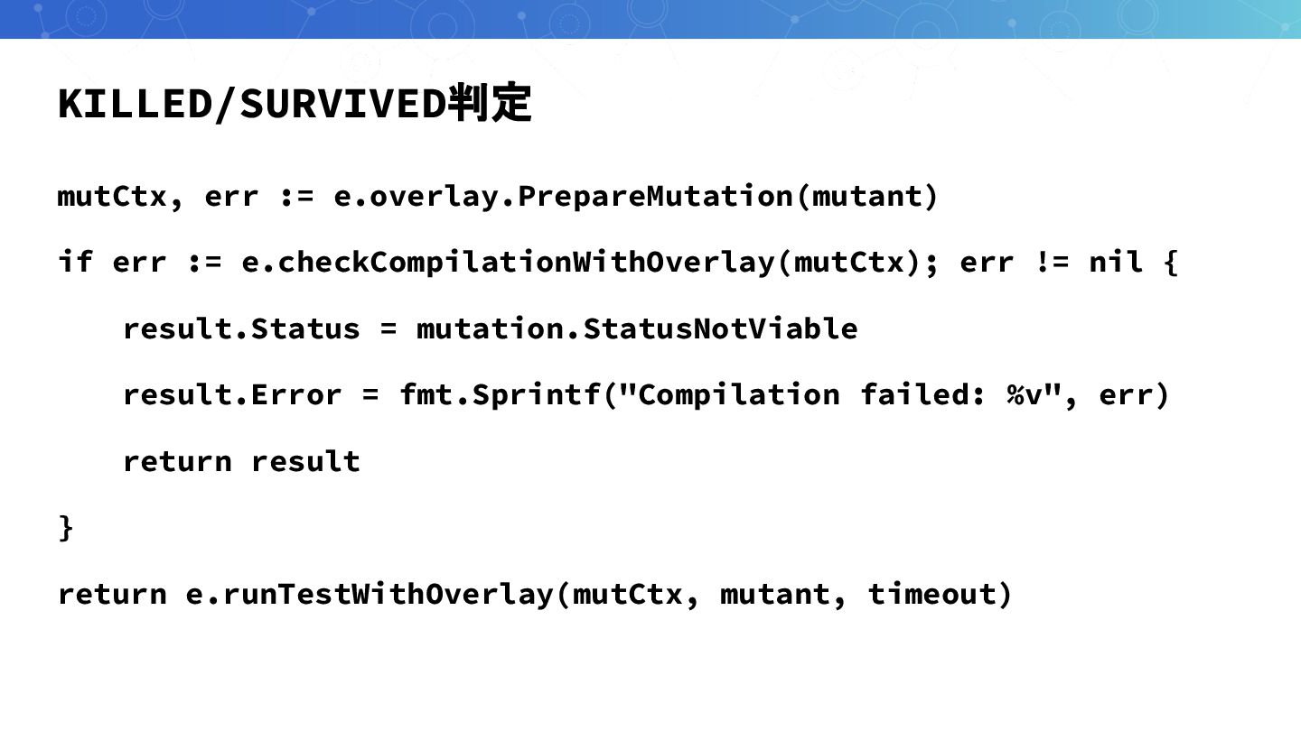 KILLED/SURVIVED判定 mutCtx, err := e.overlay.PrepareMutation(mutant) if err := e.checkCompilationWithOverlay(mutCtx); err