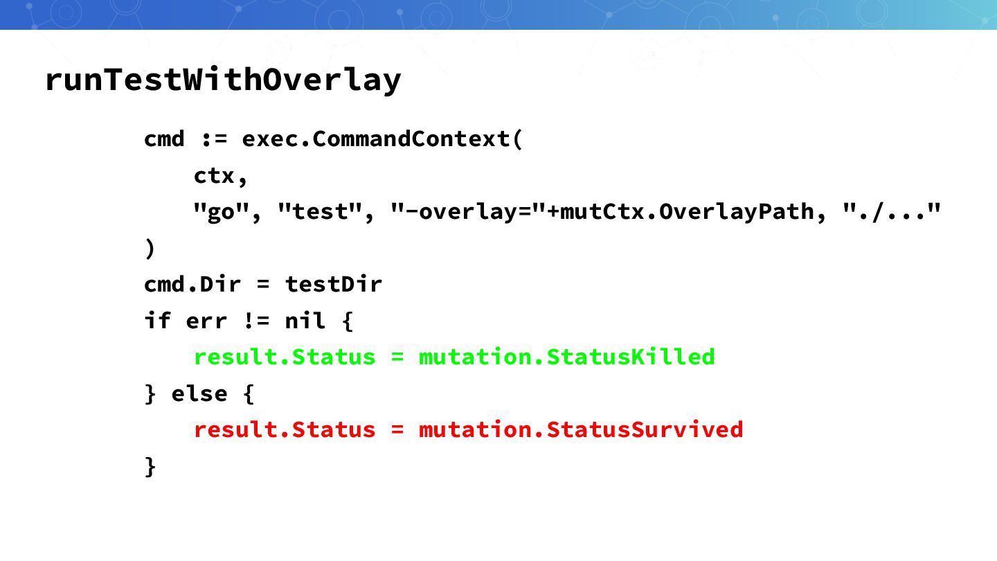 runTestWithOverlay cmd := exec.CommandContext( ctx, "go", "test", "-overlay="+mutCtx.OverlayPath, "./..." )