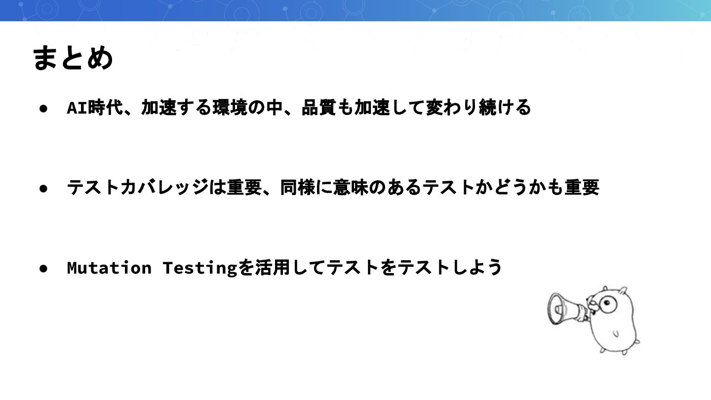 まとめ • AI時代、加速する環境の中、品質も加速して変わり続ける • テストカバレッジは重要、同様に意味のあるテストかどうかも重要 • Mutation Testingを活用してテストをテストしよう