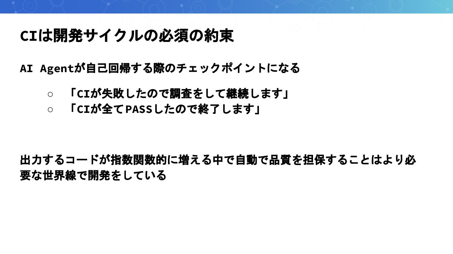 CIは開発サイクルの必須の約束 AI Agentが自己回帰する際のチェックポイントになる ◦ 「CIが失敗したので調査をして継続します」 ◦ 「CIが全てPASSしたので終了します」 出力するコードが指数関数的に増える中で自動で品質を担保することはより必 要な世界線で開発をしている