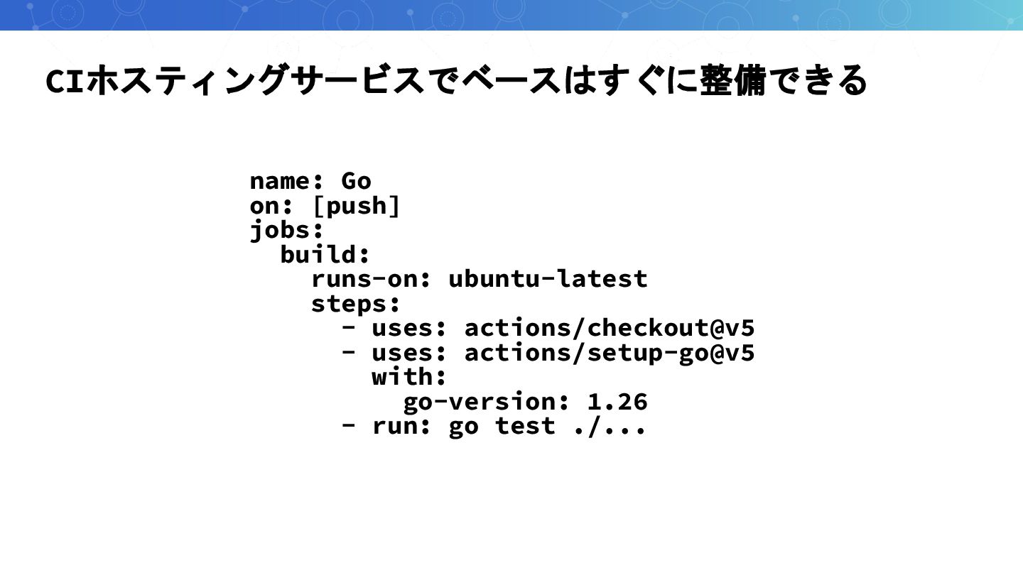 CIホスティングサービスでベースはすぐに整備できる name: Go on: [push] jobs: build: runs-on: ubuntu-latest steps: