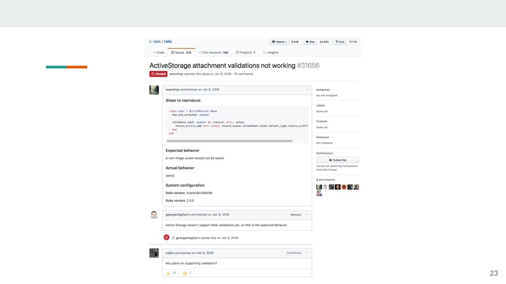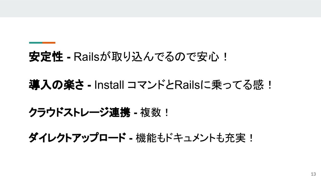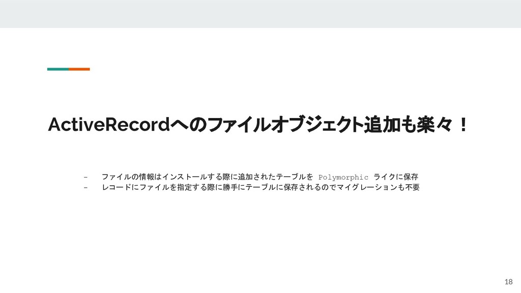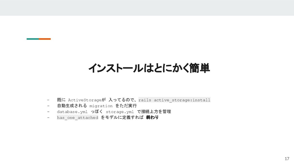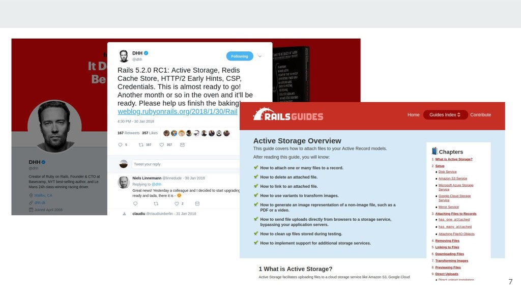 to a cloud storage service like Amazon S3, Google Cloud Storage, or Microsoft Azure Storage and attaching those files to Active Record objects. It comes with a local disk-based service for development and testing and supports mirroring files to subordinate services for backups and migrations. Using Active Storage, an application can transform image uploads with ImageMagick, generate image representations of non-image uploads like PDFs and videos, and extract metadata from arbitrary files. https://edgeguides.rubyonrails.org/active_storage_overview.html 6