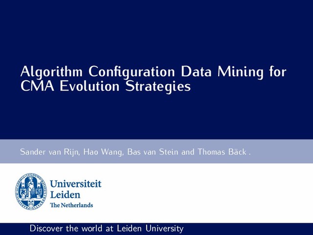 Selected CMA-ES Modules Active Update Elitism Mirrored Sampling Orthogonal Sampling Sequential Selection Threshold Convergence TPA Pairwise Selection Recombination Weights Quasi-Gaussian Sampling Increasing Population → [0,0,0,0,0,0,0,0,0,0,0] [0,0,0,0,0,0,0,0,0,0,1] [0,0,0,0,0,0,0,0,0,0,2] ... [1,1,1,1,1,1,1,1,1,2,0] [1,1,1,1,1,1,1,1,1,2,1] [1,1,1,1,1,1,1,1,1,2,2] 29 × 32 = 4 608 → S. van Rijn, H. Wang, M. van Leeuwen and T. B¨ ack, ”Evolving the structure of Evolution Strategies,” 2016 IEEE Symposium Series on Computational Intelligence (SSCI), Athens, 2016, pp. 1-8. DOI: 10.1109/SSCI.2016.7850138